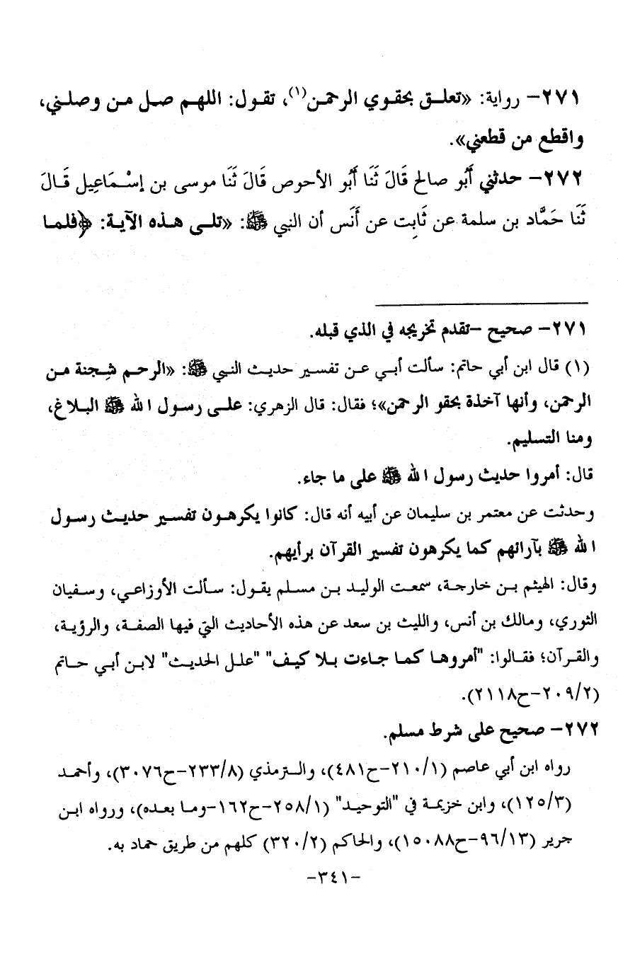 272 - حَدَّثَنِي أَبُو صَالِحٍ، قَالَ: ثنا أَبُو الْأَحْوَصِ، قَالَ: ثنا مُوسَى بْنُ إِسْمَاعِيلَ، قَالَ: ثنا حَمَّادُ بْنُ سَلَمَةَ، عَنْ ثَابِتٍ، عَنْ أَنَسٍ، أَنَّ النَّبِيَّ صَلَّى اللَّهُ عَلَيْهِ وَسَلَّمَ تَلَا هَذِهِ الْآيَةَ: {§فَلَمَّا -[343]- تَجَلَّى رَبُّهُ لِلْجَبَلِ جَعَلَهُ دَكًّا} [الأعراف: 143]، قَالَ: هَكَذَا بِأُصْبُعِهِ، وَوَضَعَ النَّبِيُّ صَلَّى اللَّهُ عَلَيْهِ وَسَلَّمَ الْإِبْهَامَ عَلَى الْمِفْصَلِ الْأَعْلَى مِنَ الْخِنْصَرِ فَسَاخَ الْجَبَلُ "