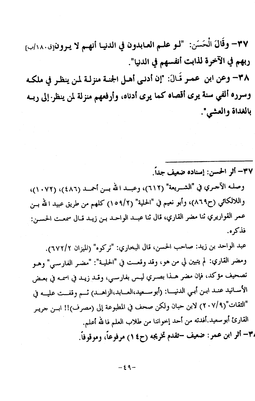 37 - وَقَالَ الْحَسَنُ: «لَوْ عَلِمَ الْعَابِدُونَ فِي الدُّنْيَا أَنَّهُمْ لَا يَرَوْنَ رَبَّهُمْ فِي الْآخِرَةِ لَذَابَتْ أَنْفُسُهُمْ فِي الدُّنْيَا»