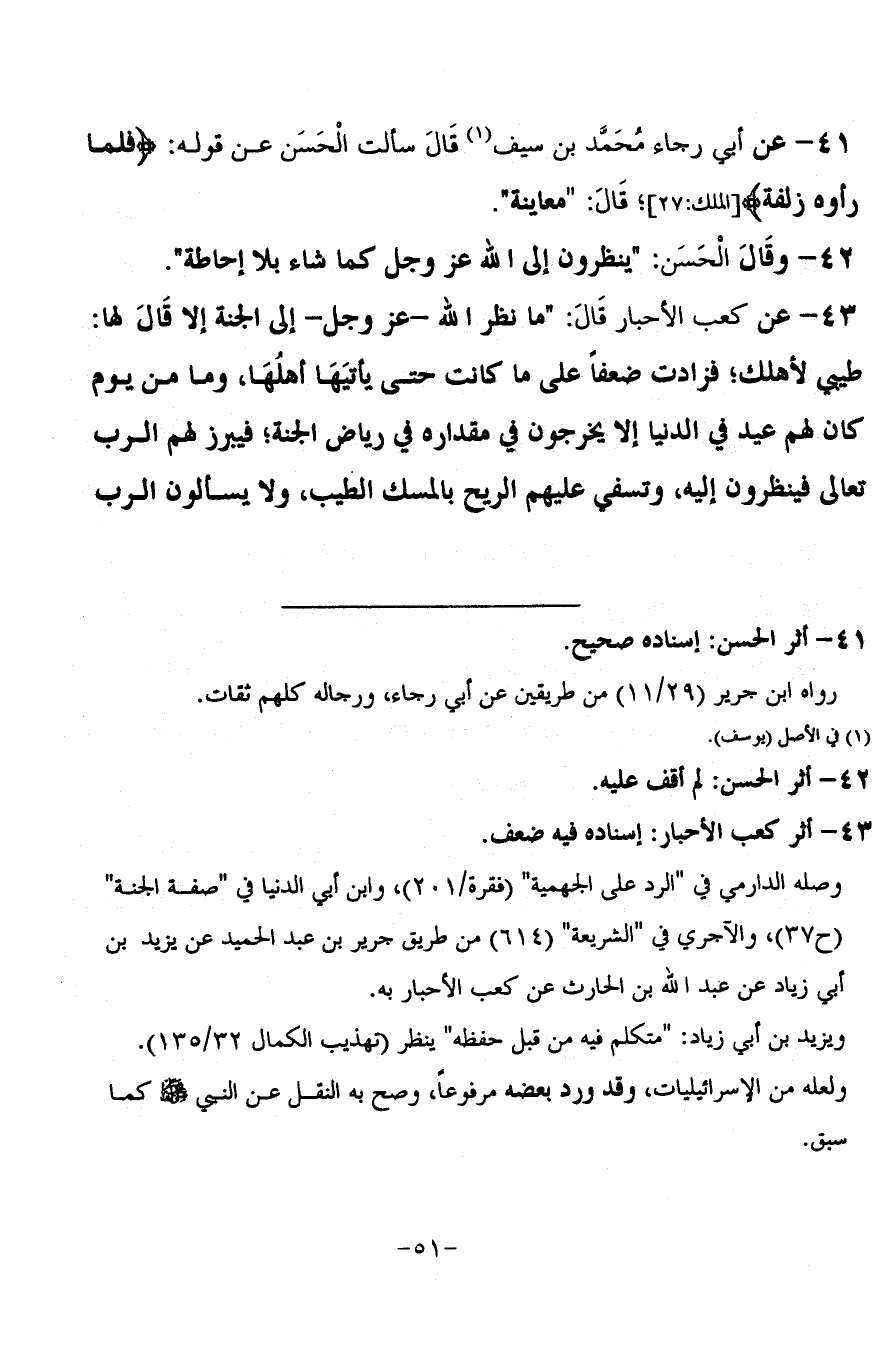 41 - عَنْ أَبِي رَجَاءٍ مُحَمَّدِ بْنِ سَيْفٍ قَالَ: سَأَلْتُ الْحَسَنَ عَنْ قَوْلِهِ: {فَلَمَّا رَأَوْهُ زُلْفَةً} [الملك: 27]، قَالَ: مُعَايَنَةً
