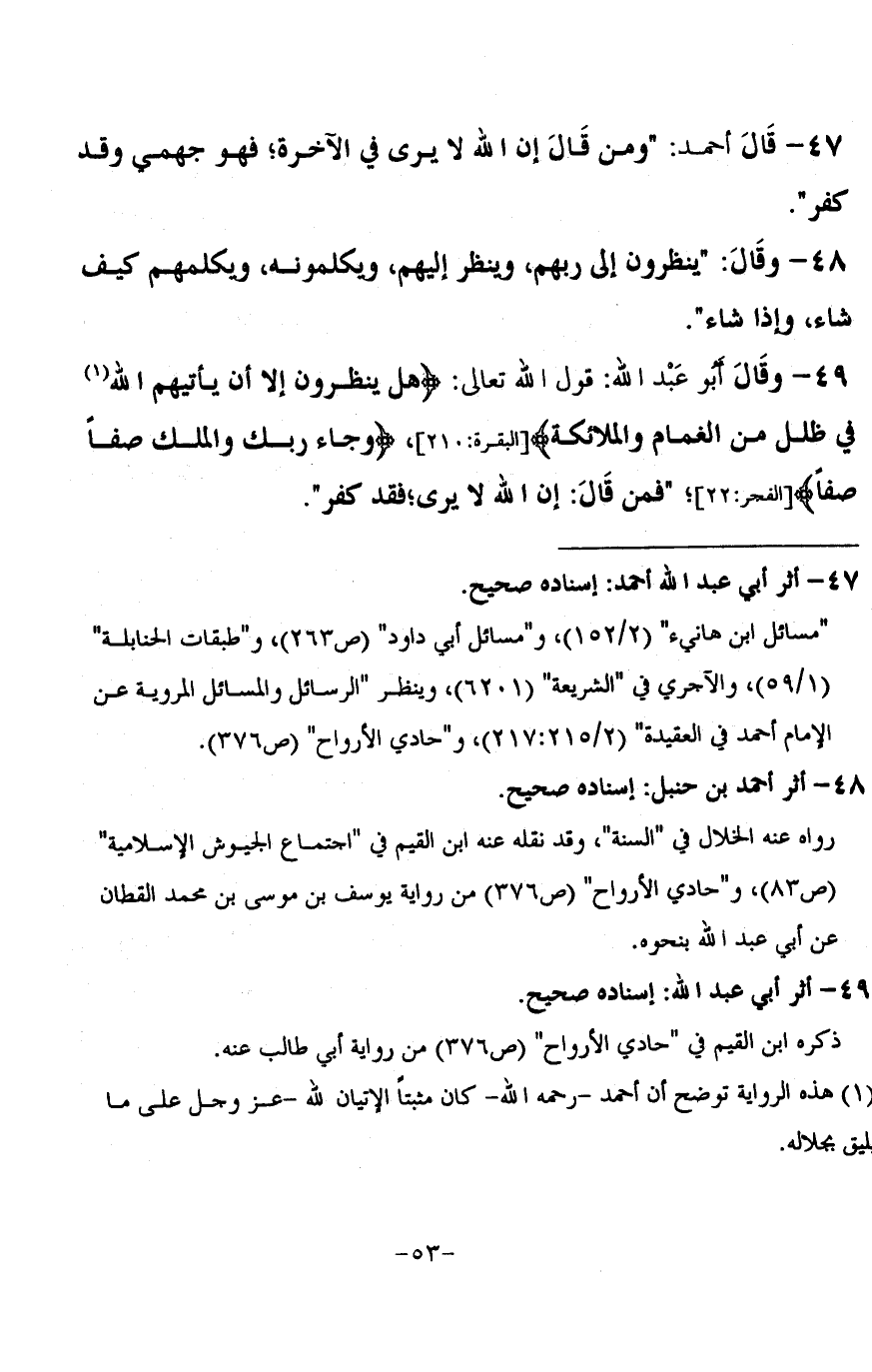 47 - قَالَ أَحْمَدُ: وَمَنْ قَالَ: إِنَّ اللَّهَ لَا يُرَى فِي الْآخِرَةِ، فَهُوَ جَهْمِيٌّ وَقَدْ كَفَرَ،