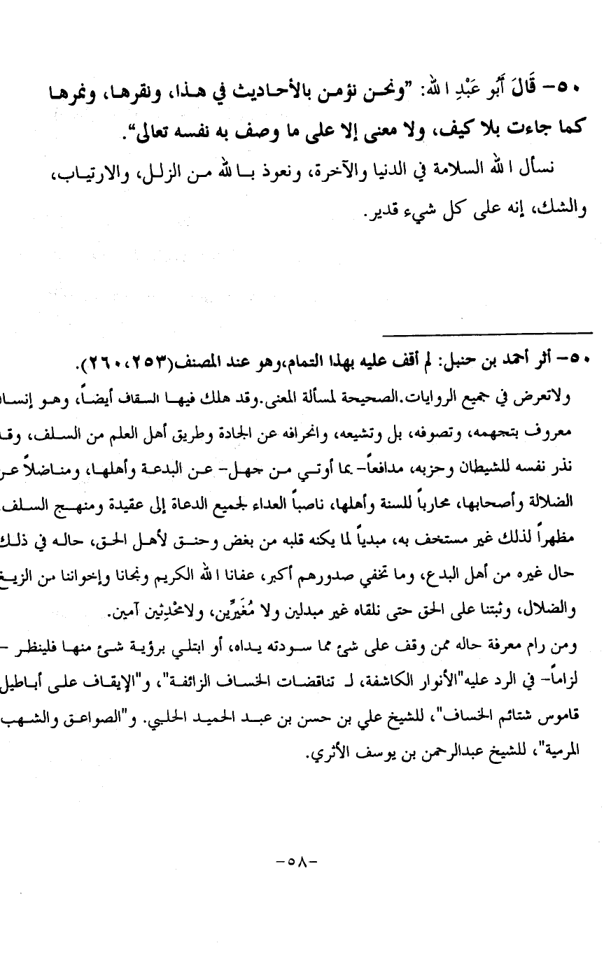 50 - قَالَ أَبُو عَبْدِ اللَّهِ: وَنَحْنُ نُؤْمِنُ بِالْأَحَادِيثِ فِي هَذَا وَنُقِرُّهَا، وَنُمِرُّهَا كَمَا جَاءَتْ بِلَا كَيْفٍ، وَلَا مَعْنًى إِلَّا عَلَى مَا وَصَفَ بِهِ نَفْسَهُ تَعَالَى، نَسْأَلُ اللَّهَ السَّلَامَةَ فِي الدُّنْيَا وَالْآخِرَةِ، وَنَعُوذُ بِاللَّهِ مِنَ الزَّلَلِ، وَالِارْتِيَابِ وَالشَّكِّ إِنَّهُ عَلَى كُلِّ شَيْءٍ قَدِيرٌ -[59]-