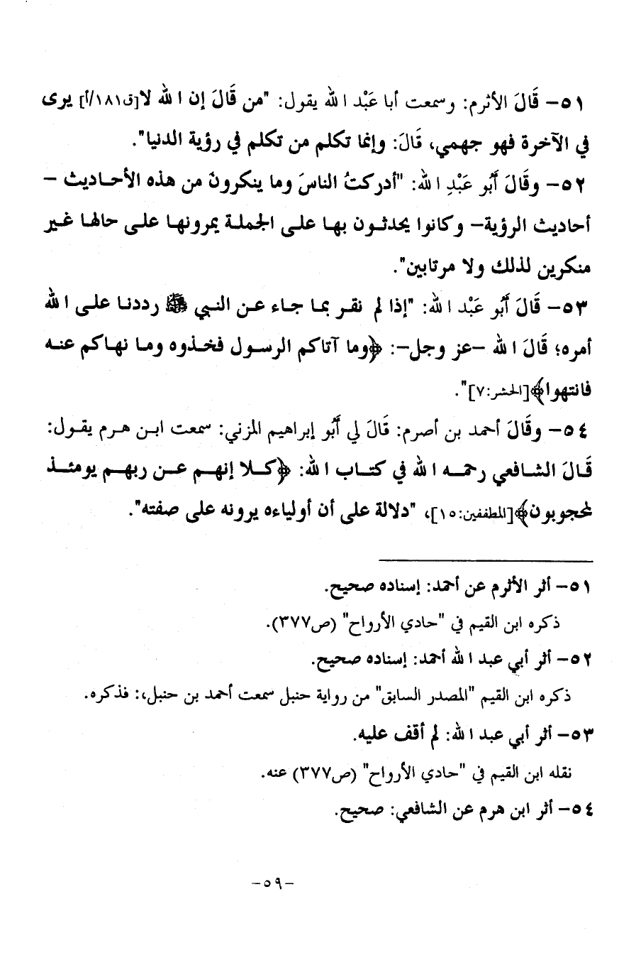 54 - وَقَالَ أَحْمَدُ بْنُ أَصْرَمَ: قَالَ لِي أَبُو إِبْرَاهِيمَ الْمُزَنِيُّ: سَمِعْتُ ابْنَ هَرِمٍ، يَقُولُ: قَالَ الشَّافِعِيُّ رَحِمَهُ اللَّهُ فِي كِتَابِ اللَّهِ: {§كَلَّا إِنَّهُمْ عَنْ رَبِّهِمْ يَوْمَئِذٍ لَمَحْجُوبُونَ} [المطففين: 15]، دَلَالَةٌ عَلَى أَنَّ أَوْلِيَاءَهُ يَرَوْنَهُ عَلَى صِفَتِهِ