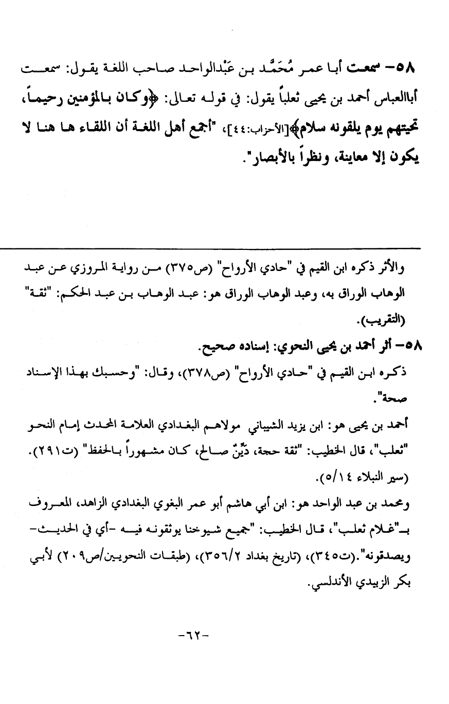 58 - سَمِعْتُ أَبَا عُمَرَ مُحَمَّدَ بْنَ عَبْدِ الْوَاحِدِ صَاحِبَ اللُّغَةِ يَقُولُ: سَمِعْتُ أَبَا الْعَبَّاسِ أَحْمَدَ بْنَ يَحْيَى ثَعْلَبًا يَقُولُ: فِي قَوْلِهِ تَعَالَى: {§وَكَانَ بِالْمُؤْمِنِينَ رَحِيمًا تَحِيَّتُهُمْ يَوْمَ يَلْقَوْنَهُ سَلَامٌ} [الأحزاب: 44] أَجْمَعَ أَهْلُ اللُّغَةِ أَنَّ اللِّقَاءَ هَاهُنَا لَا يَكُونُ إِلَّا مُعَايَنَةً وَنَظَرًا بِالْأَبْصَارِ