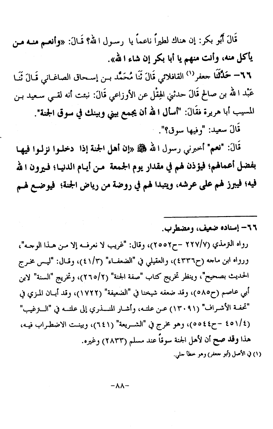 66 - حَدَّثَنَا جَعْفَرٌ الْقَافْلَائِي، قَالَ: ثنا مُحَمَّدُ بْنُ إِسْحَاقَ الصَّاغَانِيُّ، قَالَ: ثنا عَبْدُ اللَّهِ بْنُ صَالِحٍ، قَالَ: حَدَّثَنِي الْهِقْلُ، عَنِ الْأَوْزَاعِيِّ، قَالَ: نُبِّئْتُ، أَنَّهُ لَقِيَ سَعِيدُ بْنُ الْمُسَيِّبِ أَبَا هُرَيْرَةَ فَقَالَ: أَسْأَلُ اللَّهَ أَنْ يَجْمَعَ بَيْنِي وَبَيْنَكَ فِيَ سُوقِ الْجَنَّةِ، قَالَ سَعِيدٌ: وَفِيهَا سُوقٌ؟ قَالَ: نَعَمْ، أَخْبَرَنِي رَسُولُ اللَّهِ صَلَّى اللَّهُ عَلَيْهِ وَسَلَّمَ: «إِنَّ §أَهْلَ الْجَنَّةِ إِذَا دَخَلُوا نَزَلُوا فِيهَا بِفَضْلِ أَعْمَالِهِمْ، فَيُؤْذَنُ لَهُمْ فِي مِقْدَارِ يَوْمِ الْجُمُعَةِ مِنْ أَيَّامِ الدُّنْيَا، فَيَرَوْنَ اللَّهَ فِيهِ، فَيَبْرُزُ لَهُمْ عَلَى عَرْشِهِ، وَيَتَبَدَّى لَهُمْ فِي رَوْضَةٍ مِنْ رِيَاضِ الْجَنَّةِ، فَيُوضَعُ لَهُمْ -[89]- مَنَابِرُ مِنْ يَاقُوتٍ وَمَنَابِرُ مِنْ ذَهَبٍ وَمَنَابِرُ مِنْ فِضَّةٍ، وَيَجْلِسُ أَدْنَاهُمْ وَمَا فِيهِمْ مِنْ دَنِيٍّ عَلَى كُثْبَانِ الْمِسْكِ وَالْكَافُورِ، وَمَا يَرَوْنَ أَنَّ أَصْحَابَ الْكَرَاسِيِّ أَفْضَلُ مِنْهُمْ مَجْلِسًا». قَالَ أَبُو هُرَيْرَةَ: قُلْتُ: يَا رَسُولَ اللَّهِ، وَهَلْ نَرَى رَبَّنَا؟ قَالَ: «نَعَمْ، هَلْ تُمَارُونَ فِي رُؤْيَةِ الشَّمْسِ، وَالْقَمَرِ لَيْلَةَ الْبَدْرِ؟» فَقُلْتُ: لَا، قَالَ: وَكَذَلِكَ لَا تَمْتَرُونَ فِي رُؤْيَةِ رَبِّكُمْ، وَلَا يَبْقَى فِي ذَلِكَ الْمَجْلِسِ أَحَدٌ إِلَّا حَاضَرَهُ اللَّهُ مُحَاضَرَةً حَتَّى إِنَّهُ يَقُولُ لِلرَّجُلِ مِنْكُمْ: يَا فُلَانُ ابْنَ فُلَانٍ تَذْكُرِ يَوْمُ عَمِلْتَ بِكَذَا وَكَذَا؟ وَيُذَكِّرُهُ بَعْضِ غَدْرَاتِهِ فِي الدُّنْيَا، فَيَقُولُ: يَا رَبِّ أَوَلَمْ تَغْفِرْ لِي؟ فَيَقُولُ: بَلَى فَبِسَعَةِ مَغْفِرَتِي بَلَغْتَ مَنْزِلَتَكَ هَذِهِ، قَالَ: فَبَيْنَا هُمْ كَذَلِكَ غَشِيَتْهُمْ سَحَابَةٌ مِنْ فَوْقِهِمْ فَأَمَرَّتْ عَلَيْهِمْ طِيبًا لَمْ يَجِدُوا مِثْلَ رِيحِهِ شَيْئًا قَطُّ، قَالَ: ثُمَّ يَقُولُ رَبُّنَا: قُومُوا إِلَى مَا أَعْدَدْتُ لَكُمْ مِنَ الْكَرَامَةِ، فَنَأْتِي سُوقًا قَدْ حَفَّتْ بِهِ الْمَلَائِكَةُ، فِيهِ مَا لَمْ تَنْظُرِ الْعُيُونُ إِلَى مِثْلِهِ وَلَمْ تَسْمَعِ الْآذَانُ، وَلَمْ يَخْطِرْ عَلَى الْقُلُوبِ، وَيَحْمِلُ لَنَا مَا اشْتَهَيْنَا، لَيْسَ فِي شَيْءٍ يُبَاعُ وَلَا يُشْتَرَى، وَفِي ذَلِكَ السُّوقِ يَلْقَى أَهْلُ الْجَنَّةِ بَعْضُهُمْ بَعْضًا، -[90]- قَالَ: فَيُقْبِلُ الرَّجُلُ ذُو الْمَنْزِلَةِ الرَّفِيعَةِ، فَيَلْقَى مَنْ هُوَ دُونَهُ، فَيُرَوِّعُهُ مَا يَرَى عَلَيْهِ مِنَ اللِّبَاسِ فَمَا يَقْضِي آخِرَ حَدِيثِهِ حَتَّى يَتَمَثَّلَ عَلَيْهِ أَحْسَنَ مِنْهُ، وَكَذَلِكَ أَنَّهُ لَا يَنْبَغِي لِأَحَدٍ أَنْ يَحْزَنَ فِيهَا، قَالَ: فَنُصْرَفُ إِلَى مَنَازِلِنَا فَتَتَلَقَّانَا أَزْوَاجُنَا، فَيَقُلْنَ: مَرْحَبًا وَأَهْلًا بِحَبِيبِنَا، لَقَدْ جِئْتَ وَإِنَّ بِكَ مِنَ الْجَمَالِ وَالطِّيبِ أَفْضَلَ مِمَّا فَارَقْتَنَا عَلَيْهِ، قَالَ: فَيَقُولُ: إِنَّا جَالَسْنَا الْيَوْمَ رَبَّنَا الْجَبَّارَ، فَيَحِقُّ لَنَا أَنْ نَنْقَلِبَ بِمِثْلِ مَا انْقَلَبْنَا بِهِ "