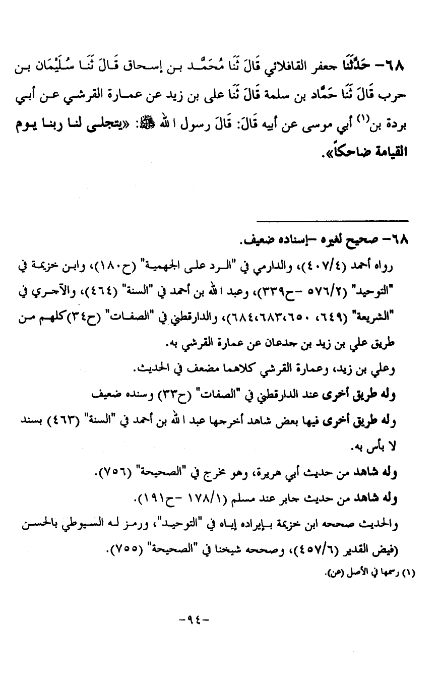 68 - حَدَّثَنَا جَعْفَرٌ الْقَافْلَائِي، قَالَ: ثنا مُحَمَّدُ بْنُ إِسْحَاقَ، قَالَ: ثنا سُلَيْمَانُ بْنُ حَرْبٍ، قَالَ: ثنا حَمَّادُ بْنُ سَلَمَةَ، قَالَ: ثنا عَلِيُّ بْنُ زَيْدٍ، عَنْ عُمَارَةَ الْقُرَشِيِّ، عَنْ أَبِي بُرْدَةَ بْنِ أَبِي مُوسَى، عَنْ أَبِيهِ، قَالَ: قَالَ رَسُولُ اللَّهِ صَلَّى اللَّهُ عَلَيْهِ وَسَلَّمَ: § «يَتَجَلَّى لَنَا رَبُّنَا يَوْمَ الْقِيَامَةِ ضَاحِكًا»