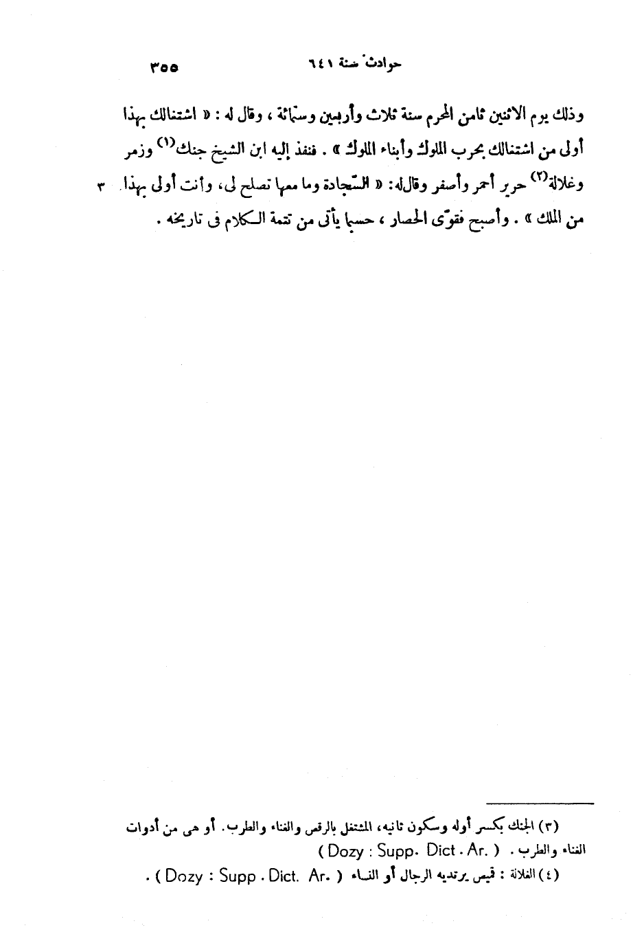 وذلك يوم الاثنين ثامن المحرم سنة ثلاث وأربعين وستمائة، وقال له: «اشتغالك بهذا أولى من اشتغالك بحرب الملوك وأبناء الملوك». فنفذ إليه ابن الشيخ جنك وزمر وغلالة حرير أحمر وأصفر وقال له: «السّجادة وما معها تصلح لى، وأنت أولى بهذا من الملك». وأصبح فقوّى الحصار، حسبما يأتى من تتمة الكلام فى تاريخه.