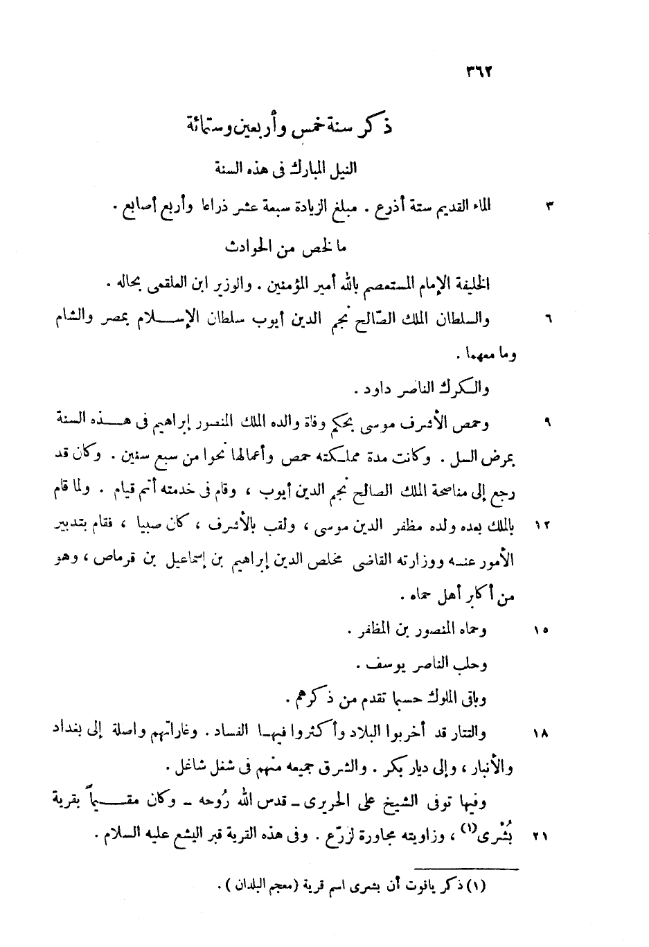 وحمص الأشرف موسى بحكم وفاة والده الملك المنصور إبراهيم فى هذه السنة بمرض السل. وكانت مدة مملكته حمص وأعمالها نحوا من سبع سنين. وكان قد رجع إلى مناصحة الملك الصالح نجم الدين أيوب، وقام فى خدمته أتم قيام. ولما قام بالملك بعده ولده مظفر الدين موسى، ولقب بالأشرف، كان صبيا، فقام بتدبير الأمور عنه ووزارته القاضى مخلص الدين إبراهيم بن إسماعيل بن قرماص، وهو من أكابر أهل حماه.