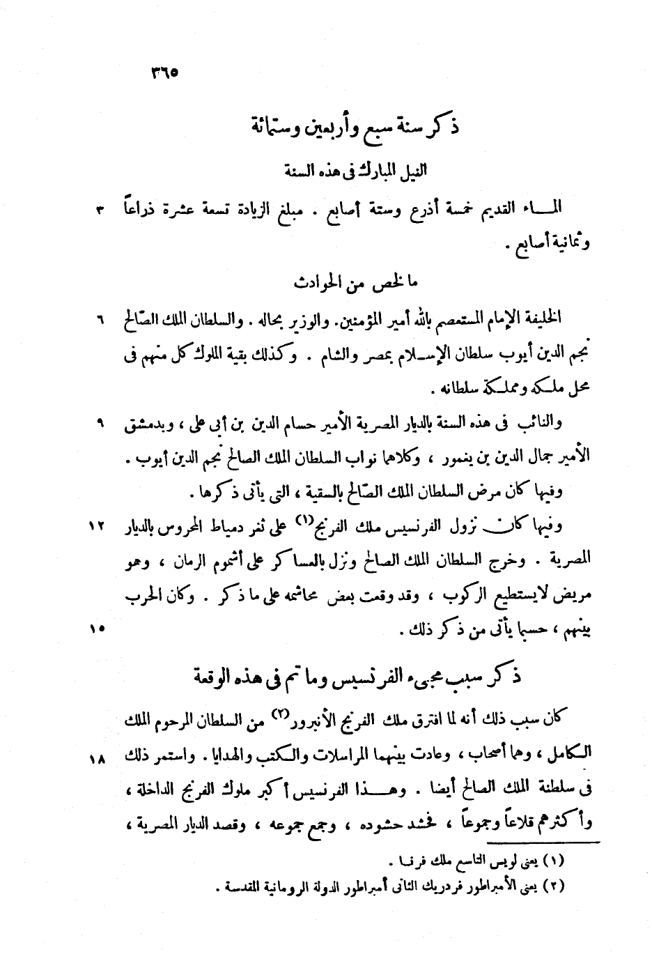 وفيها كان نزول الفرنسيس ملك الفرنج على ثغر دمياط المحروس بالديار المصرية. وخرج السلطان الملك الصالح ونزل بالعساكر على أشموم الرمان، وهو مريض لا يستطيع الركوب، وقد وقعت بعض محاشمه على ما ذكر. وكان الحرب بينهم، حسبما يأتى من ذكر ذلك.