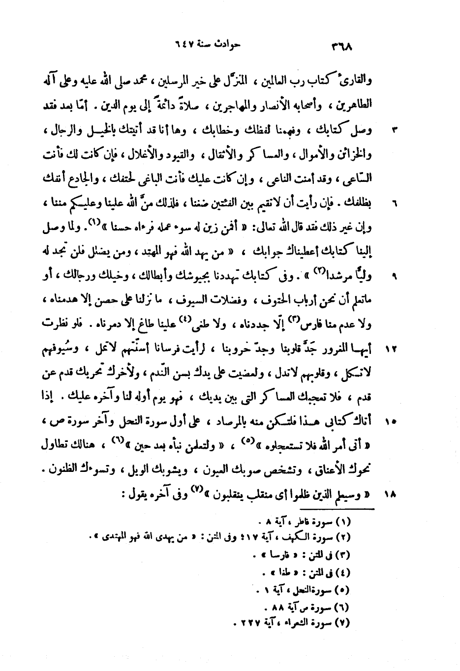 والقارئ كتاب رب العالمين، المنزّل على خير المرسلين، محمد صلى الله عليه وعلى آله الطاهرين، وأصحابه الأنصار والمهاجرين، صلاة دائمة إلى يوم الدين. أمّا بعد فقد وصل كتابك، وفهمنا لفظك وخطابك، وها أنا قد أتيتك بالخيل والرجال، والخزائن والأموال، والعساكر والأثقال، والقيود والأغلال، فإن كانت لك فأنت السّاعى، وقد أمنت الناعى، وإن كانت عليك فأنت الباغى لحتفك، والجادع أنفك بظلفك. فإن رأيت أن لا تقيم بين الفئتين ضغنا، فلذلك منّ الله علينا وعليكم مننا، وإن غير ذلك فقد قال الله تعالى: {أَفَمَنْ زُيِّنَ لَهُ سُوءُ عَمَلِهِ فَرَآهُ حَسَناً»}. ولما وصل إلينا كتابك أعطيناك جوابك، {مَنْ يَهْدِ اللهُ فَهُوَ الْمُهْتَدِ، وَمَنْ يُضْلِلْ فَلَنْ تَجِدَ لَهُ وَلِيًّا مُرْشِداً}». وفى كتابك تهددنا بجيوشك وأبطالك، وخيلك ورجالك، أو ما تعلم أن نحن أرباب الحتوف، وفضلات السيوف، ما نزلنا على حصن إلا هدمناه، ولا عدم منا فارس إلاّ جددناه، ولا طغى علينا طاغ إلا دمرناه. فلو نظرت أيها المغرور جدّ قلوبنا وجدّ حروبنا، لرأيت فرسانا أسنّتهم لا تمل، وسيوفهم لا تكل، وقلوبهم لا تدل، ولعضيت على يدك بسن النّدم، ولأخرك تحريك قدم عن قدم، فلا تعجبك العساكر التى بين يديك، فهو يوم أوله لنا وآخره عليك. إذا أتاك كتابى هذا فلتكن منه بالمرصاد، على أول سورة النحل وآخر سورة ص، {أَتى أَمْرُ اللهِ فَلا تَسْتَعْجِلُوهُ»}، {وَلَتَعْلَمُنَّ نَبَأَهُ بَعْدَ حِينٍ»}، هنالك تطاول نحوك الأعناق، وتشخص صوبك العيون، ويشوبك الويل، وتسوءك الظنون.