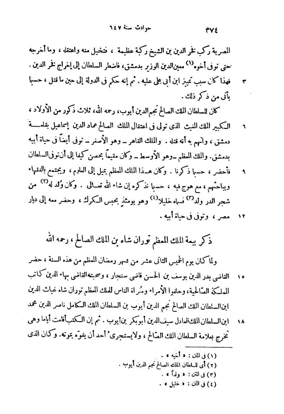 ولما كان يوم الخميس الثانى عشر من شهر رمضان المعظم من هذه السنة، حضر القاضى بدر الدين يوسف بن الحسن قاضى سنجار، وصحبته القاضى بهاء الدين كاتب المملكة الصّالحية، وحلفوا الأمراء وسراة الناس للملك المعظم توران شاه غياث الدين ابن السلطان الملك الصالح نجم الدين أيوب بن السلطان الملك الكامل ناصر الدين محمد ابن السلطان الملك العادل سيف الدين أبو بكر بن أيوب. ثم إن الكتب أقامت أياما وهى تخرج بعلامة السلطان الملك الصّالح، ولا يستجرئ أحد أن يفوّه بموته. وكان الذى