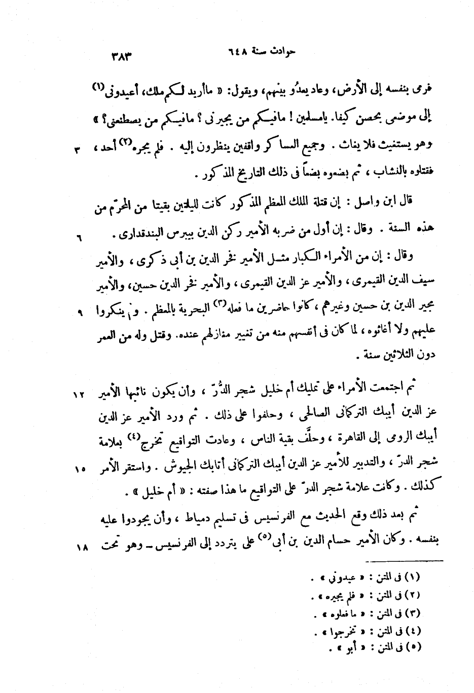 وقال: إن من الأمراء الكبار مثل الأمير فخر الدين بن أبى ذكرى، والأمير سيف الدين القيمرى، والأمير عز الدين القيمرى، والأمير فخر الدين حسين، والأمير مجير الدين بن حسين وغيرهم، كانوا حاضرين ما فعله البحرية بالمعظم. ولم ينكروا عليهم ولا أغاثوه، لما كان فى أنفسهم منه من تغيير منازلهم عنده. وقتل وله من العمر دون الثلاثين سنة.