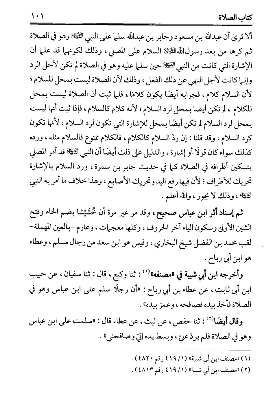 ألا ترى أن عبد الله بن مسعود وجابر بن عبد الله سلما على النبي - عليه السلام - وهو في الصلاة ثم كرها من بعد رسول الله - عليه السلام - السلام على المصلي، وذلك لكونهما قد علما أن الإشارة التي كانت من النبي - عليه السلام - حين سلما عليه وهو في الصلاة لم تكن لأجل الرد وإنما كانت لأجل النهي عن ذلك الفعل، وذلك لأن الصلاة ليست بمحل للسلام؛ لأن السلام كلام، فجوابه أيضًا يكون كلامًا، فلما ثبت أن الصلاة ليست بمحل للكلام، لم تكن أيضًا بمحل لرد السلام؛ لأنه كلام كالسلام، فإذا ثبت أنها ليست بمحل لرد السلام لم تكن أيضًا بمحل للإشارة التي تكون لرد السلام؛ لأنها تكون كرد السلام، وقد قلنا: إن ردَّ السلام كالكلام، فالكلام ممنوع فالسلام مثله، ورده كذلك سواء كان قولًا أو إشارة، والدليل على ذلك أيضًا أن النبي - عليه السلام - قد أمر المصلي بتسكين أطرافه في الصلاة كما في حديث جابر بن سمرة، ورد السلام بالإشارة تحريك للأطراف؛ لأن فيها رفع اليد وتحريك الأصابع، وهذا خلاف ما أمر به النبي - عليه السلام -، وذلك لا يجوز، والله أعلم.