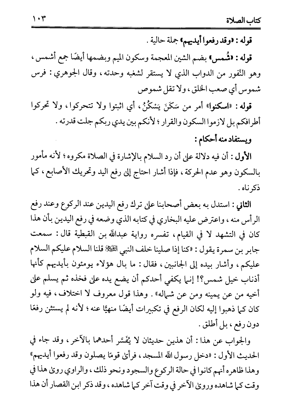 الثاني: استدل به بعض أصحابنا على ترك رفع اليدين عند الركوع وعند رفع الرأس منه، واعترض عليه البخاري في كتابه الذي وضعه في رفع اليدين بأن هذا كان في التشهد لا في القيام، تفسره رواية عبد الله بن القبطية قال: سمعت جابر بن سمرة يقول: "كنا إذا صلينا خلف النبي - عليه السلام - قلنا السلام عليكم السلام عليكم، وأشار بيده إلى الجانبين، فقال: ما بال هؤلاء يومئون بأيديهم كأنها أذناب خيل شمس؟! إنما يكفي أحدكم أن يضع يده على فخذه ثم يسلم على أخيه من عن يمينه ومن عن شماله". وهذا قول معروف لا اختلاف، فيه ولو كان كما ذهبوا إليه لكان الرفع في تكبيرات أيضًا منهيًّا عنه؛ لأنه لم يستثن رفعًا دون رفع، بل أطلق.