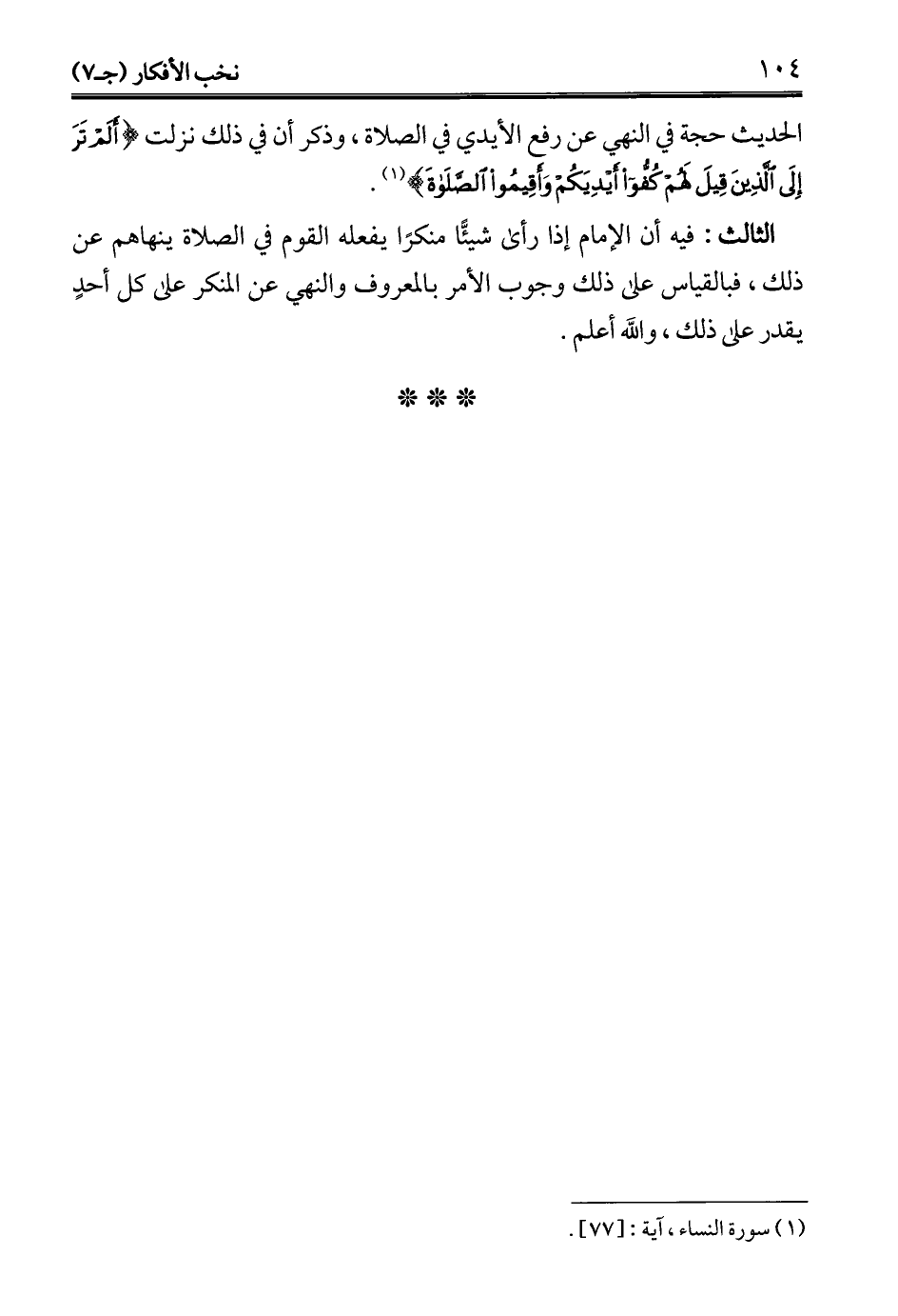 الثالث: فيه أن الإِمام إذا رأى شيئًّا منكرًا يفعله القوم في الصلاة ينهاهم عن ذلك، فبالقياس على ذلك وجوب الأمر بالمعروف والنهي عن المنكر على كل أحدٍ يقدر على ذلك، والله أعلم.