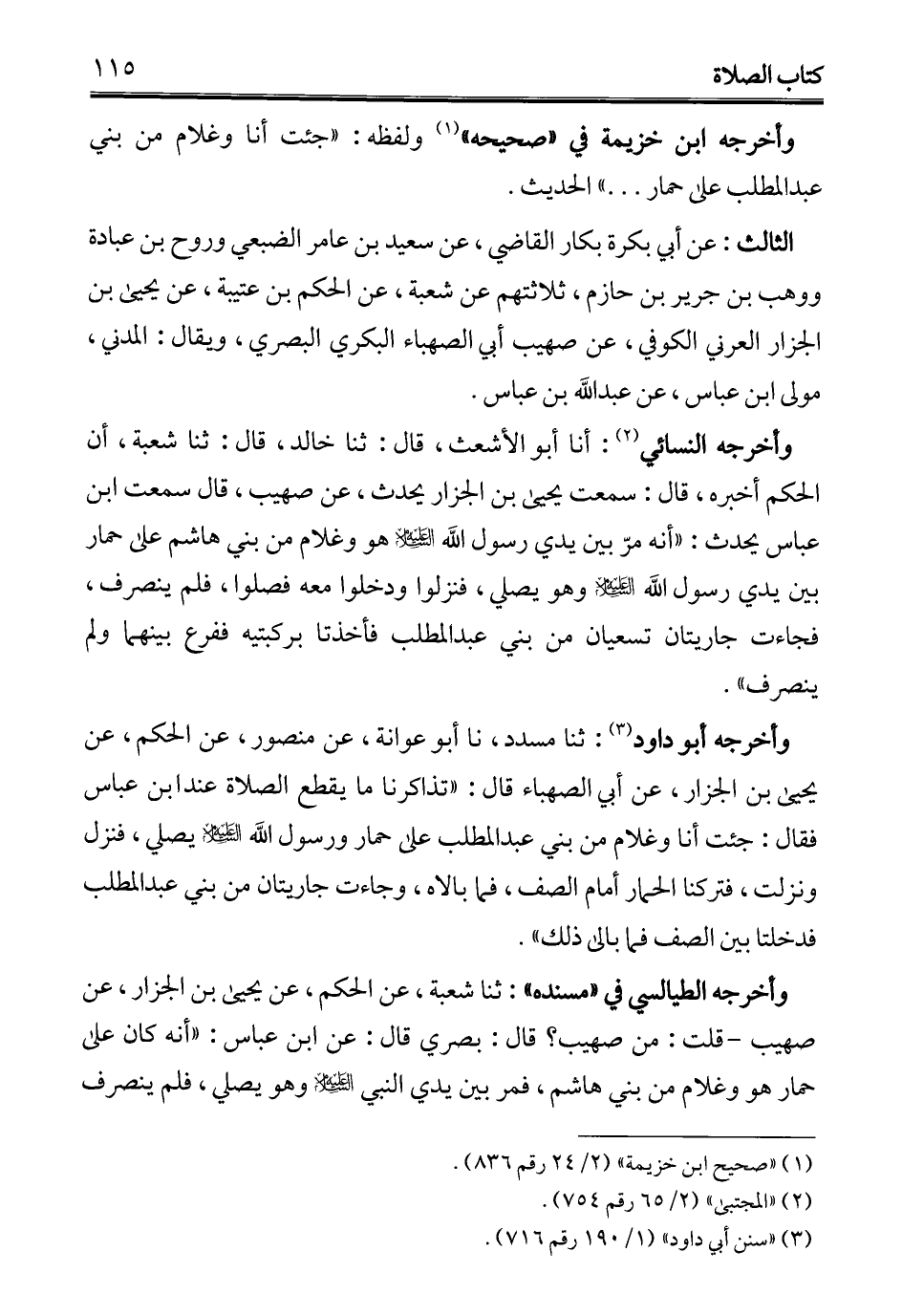 وأخرجه الطيالسي في "مسنده": ثنا شعبة، عن الحكم، عن يحيى بن الجزار، عن صهيب- قلت: من صهيب؟ قال: بصري قال: عن ابن عباس: "أنه كان على حمار هو وغلام من بني هاشم، فمر بين يدي النبي - عليه السلام - وهو يصلي، فلم ينصرف