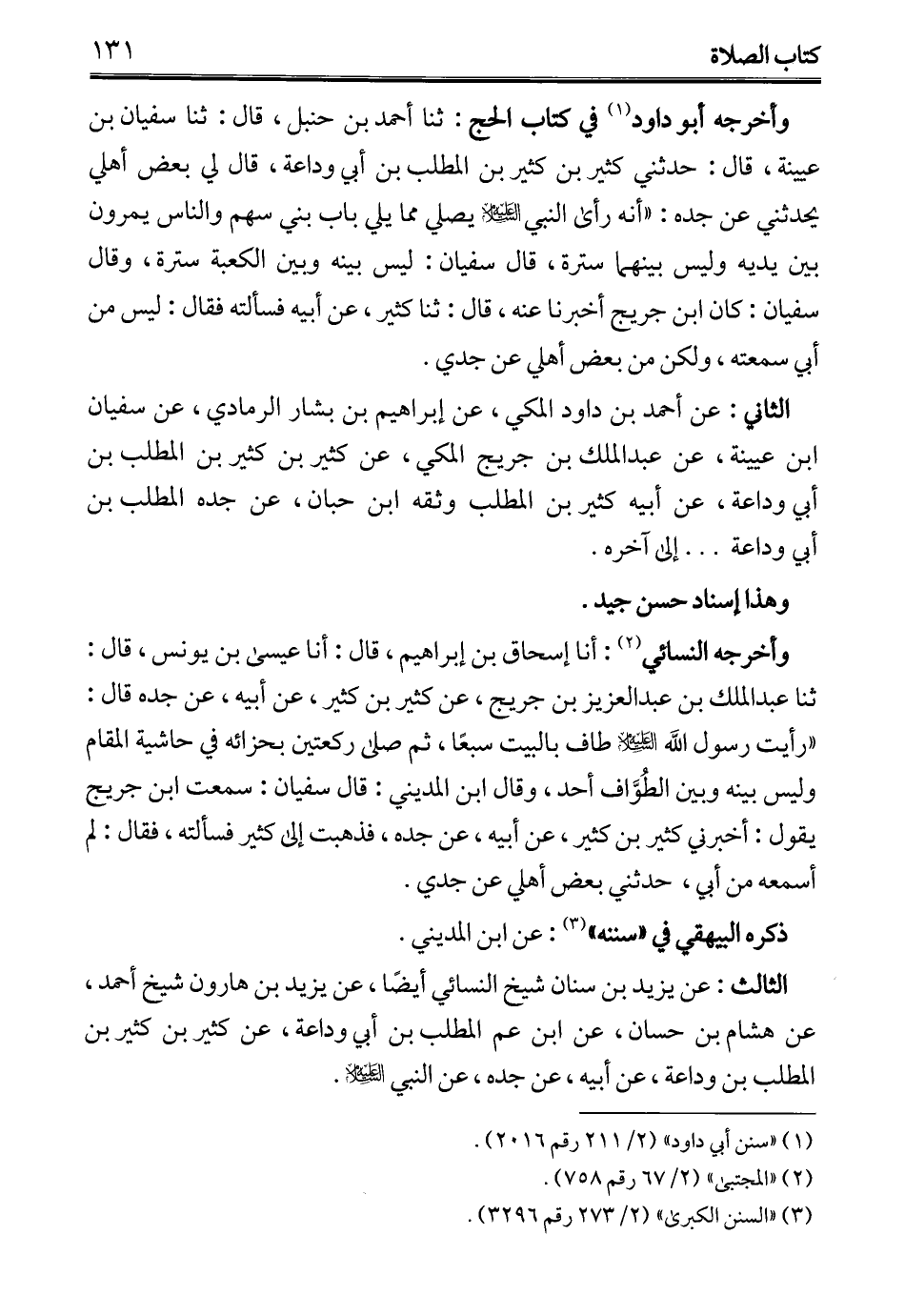 الثالث: عن يزيد بن سنان شيخ النسائي أيضًا، عن يزيد بن هارون شيخ أحمد، عن هشام بن حسان، عن ابن عم المطلب بن أبي وداعة، عن كثير بن كثير بن المطلب بن وداعة، عن أبيه، عن جده، عن النبي - عليه السلام -.