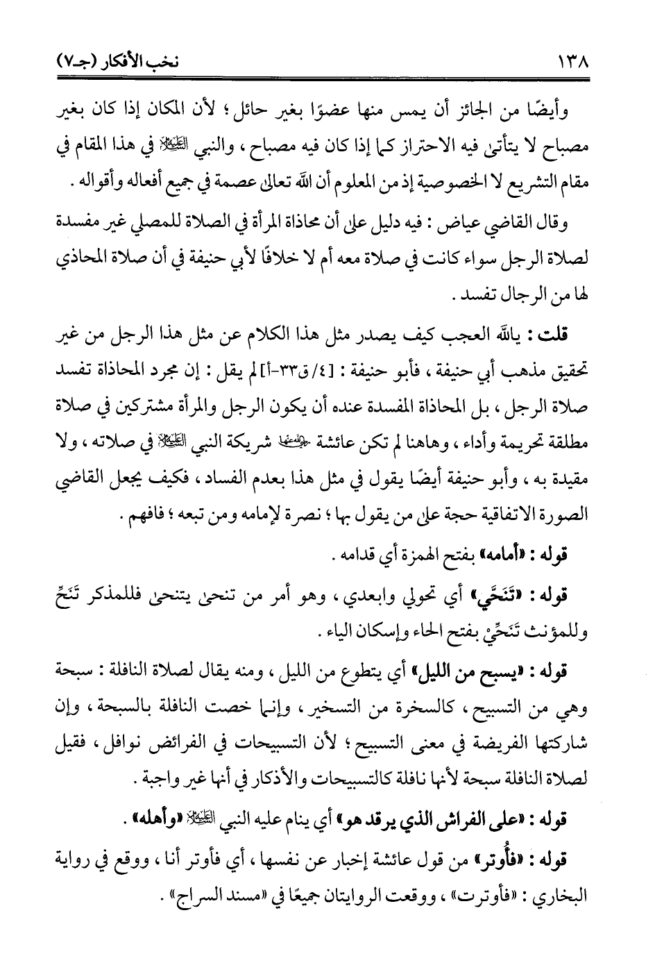 قلت: يالله العجب كيف يصدر مثل هذا الكلام عن مثل هذا الرجل من غير تحقيق مذهب أبي حنيفة، فأبو حنيفة: لم يقل: إن مجرد المحاذاة تفسد صلاة الرجل، بل المحاذاة المفسدة عنده أن يكون الرجل والمرأة مشتركين في صلاة مطلقة تحريمة وأداء، وها هنا لم تكن عائشة - رضي الله عنها - شريكة النبي - عليه السلام - في صلاته، ولا مقيدة به، وأبو حنيفة أيضًا يقول في مثل هذا بعدم الفساد، فكيف يجعل القاضي الصورة الاتفاقية حجة على من يقول بها؛ نصرة لإمامه ومن تبعه؛ فافهم.