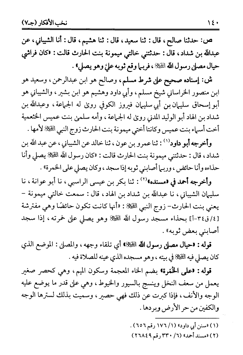 وأخرجه أبو داود (¬1): ثنا عمرو بن عون، ثنا خالد عن الشيباني، عن عبد الله بن شداد، قال: حدثتني ميمونة بنت الحارث قالت: "كان رسول الله - عليه السلام - يصلي وأنا حذاءه وأنا حائض، وربما أصابني ثوبه إذا سجد، وكان يصلي على الخمرة".
