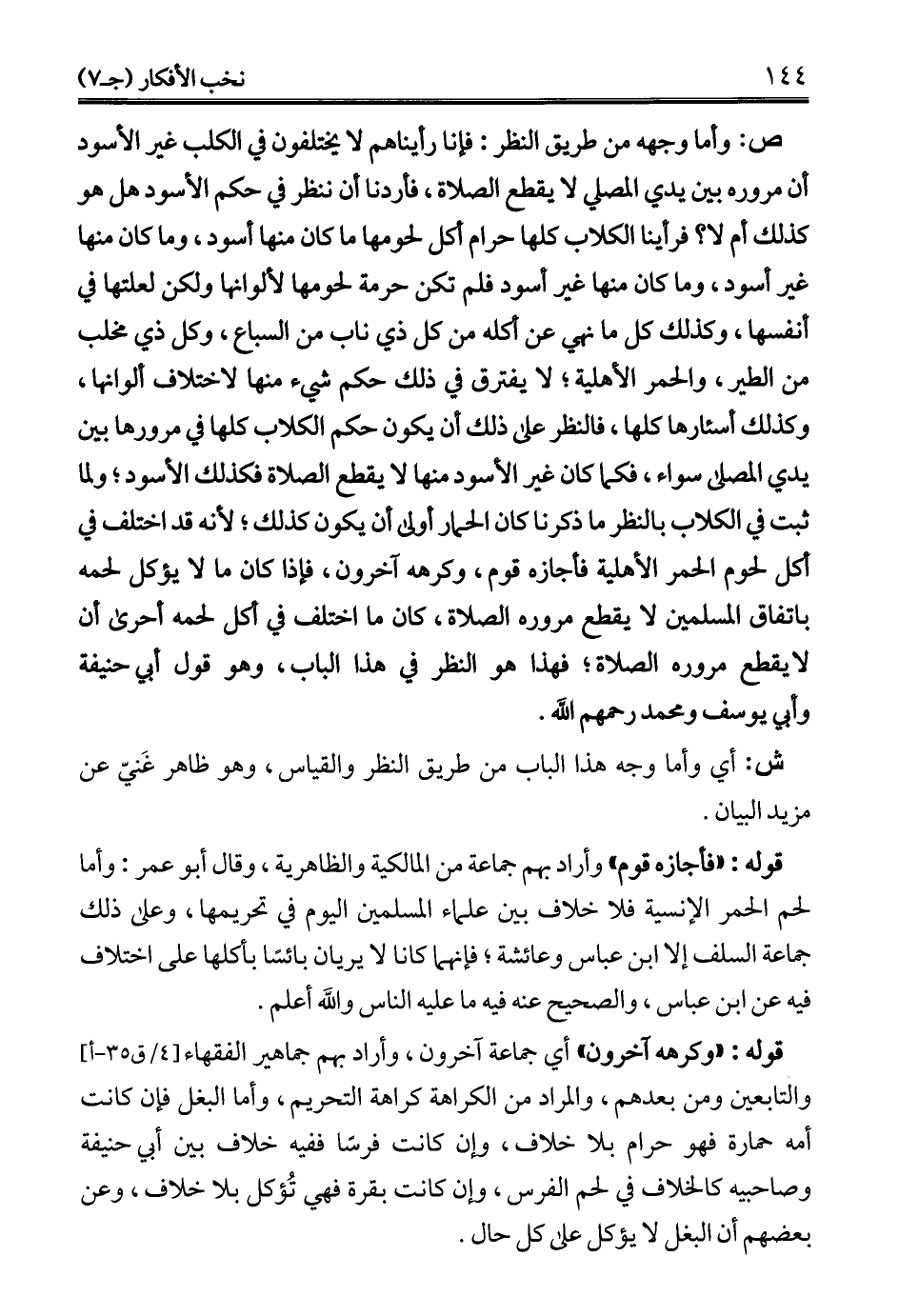 ص: وأما وجهه من طريق النظر: فإنا رأيناهم لا يختلفون في الكلب غير الأسود أن مروره بين يدي المصلي لا يقطع الصلاة، فأردنا أن ننظر في حكم الأسود هل هو كذلك أم لا؟ فرأينا الكلاب كلها حرام أكل لحومها ما كان منها أسود، وما كان منها غير أسود، وما كان منها غير أسود فلم تكن حرمة لحومها لألوانها ولكن لعلتها في أنفسها، وكذلك كل ما نهي عن أكله من كل ذي ناب من السباع، وكل ذي مخلب من الطير، والحمر الأهلية؛ لا يفترق في ذلك حكم شيء منها لاختلاف ألوانها، وكذلك أسئارها كلها، فالنظر على ذلك أن يكون حكم الكلاب كلها في مرورها بين يدي المصلى سواء، فكما كان غير الأسود منها لا يقطع الصلاة فكذلك الأسود؛ ولما ثبت في الكلاب بالنظر ما ذكرنا كان الحمار أولى أن يكون كذلك؛ لأنه قد اختلف في أكل لحوم الحمر الأهلية فأجازه قوم، وكرهه آخرون، فإذا كان ما لا يؤكل لحمه باتفاق المسلمين لا يقطع مروره الصلاة، كان ما اختلف في كل لحمه أحرى أن لا يقطع مروره الصلاة؛ فهذا هو النظر في هذا الباب، وهو قول أبي حنيفة وأبي يوسف ومحمد رحمهم الله.