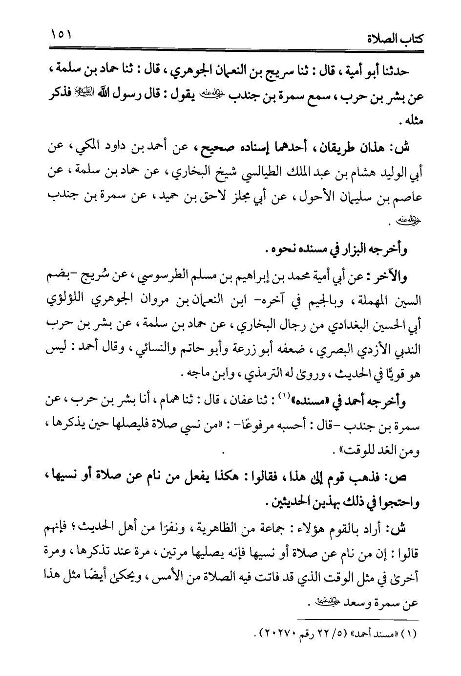 ش: هذان طريقان، أحدهما إسناده صحيح، عن أحمد بن داود المكي، عن أبي الوليد هشام بن عبد الملك الطيالسي شيخ البخاري، عن حماد بن سلمة، عن عاصم بن سليمان الأحول، عن أبي مجلز لاحق بن حميد، عن سمرة بن جندب - رضي الله عنه -.