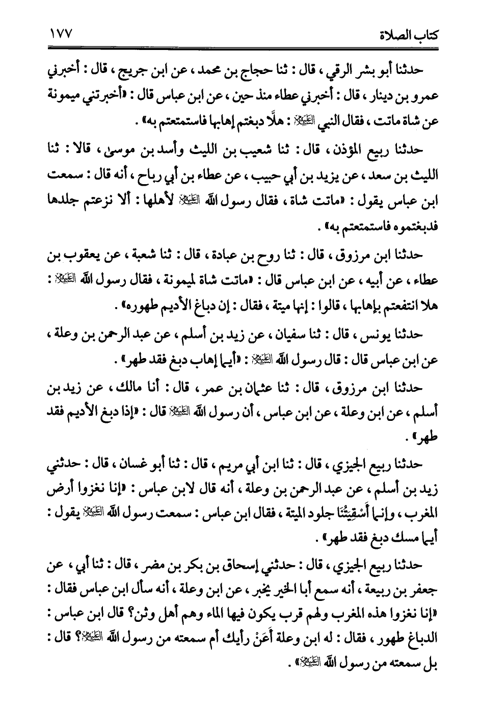 حدثنا ربيع الجيزي، قال: ثنا ابن أبي مريم، قال: ثنا أبو غسان، قال: حدثني زيد بن أسلم، عن عبد الرحمن بن وعلة، أنه قال لابن عباس: "إنا نغزوا أرض المغرب، وإنما أَسْقِيَتُنَا جلود الميتة، فقال ابن عباس: سمعت رسول الله - عليه السلام - يقول: أيما مسك دبغ فقد طهر".