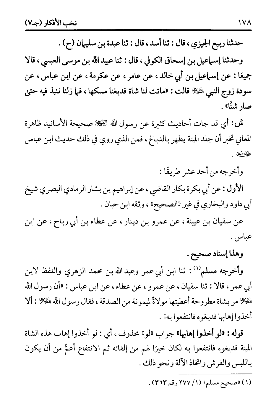 وحدثنا إسماعيل بن إسحاق الكوفي، قال: ثنا عبيد الله بن موسى العبسي، قالا جميعًا: عن إسماعيل بن أبي خالد، عن عامر، عن عكرمة، عن ابن عباس، عن سودة زوج النبي - عليه السلام - قالت: "ماتت لنا شاة فدبغنا مسكها، فما زلنا ننبذ فيه حتى صار شنًّا".