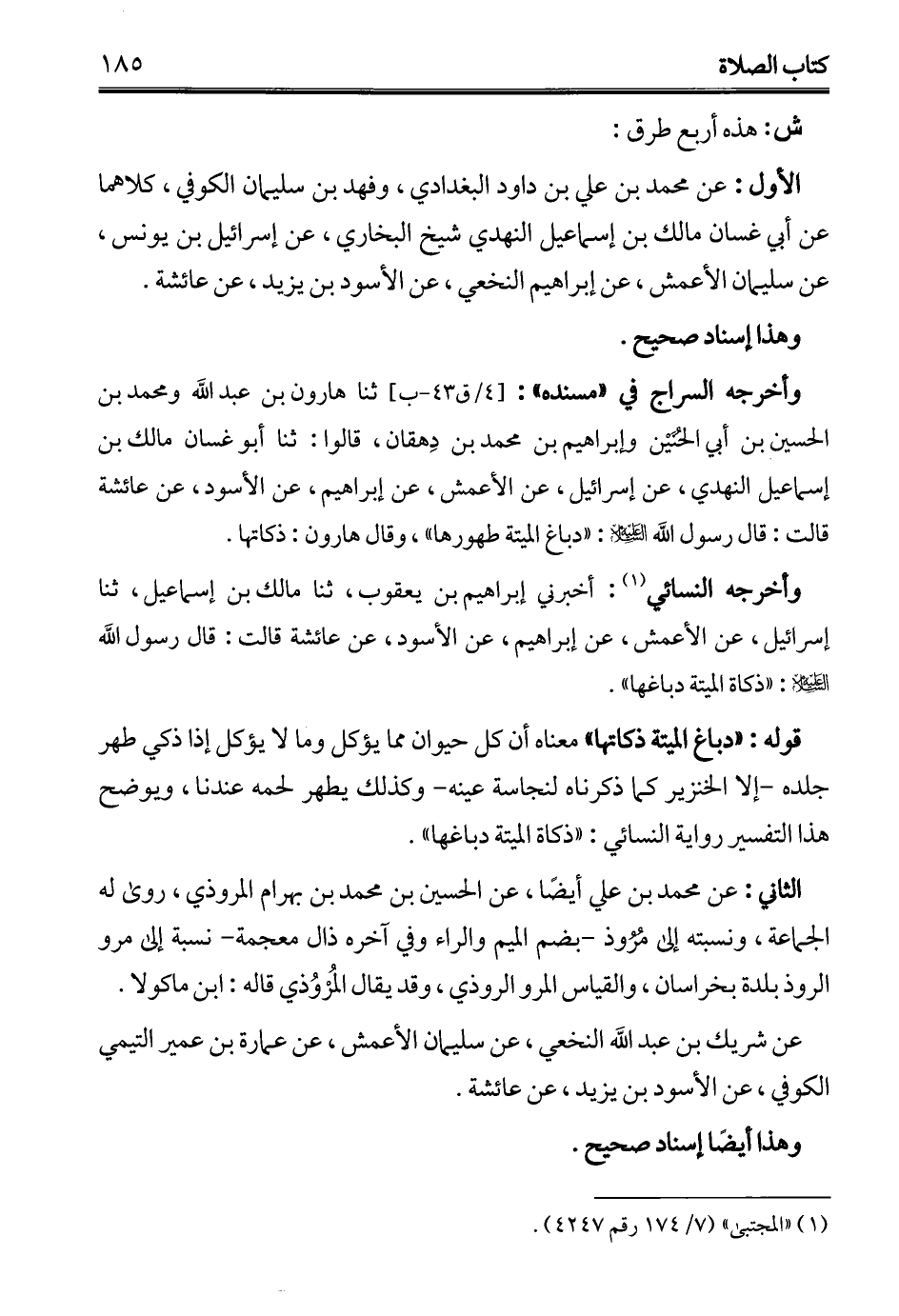 وأخرجه السراج في "مسنده": ثنا هارون بن عبد الله ومحمد بن الحسين بن أبي الحُنَيْن وإبراهيم بن محمد بن دِهقان، قالوا: ثنا أبو غسان مالك بن إسماعيل النهدي، عن إسرائيل، عن الأعمش، عن إبراهيم، عن الأسود، عن عائشة - رضي الله عنها - قالت: قال رسول الله - عليه السلام -: "دباغ الميتة طهورها"، وقال هارون: ذكاتها.
