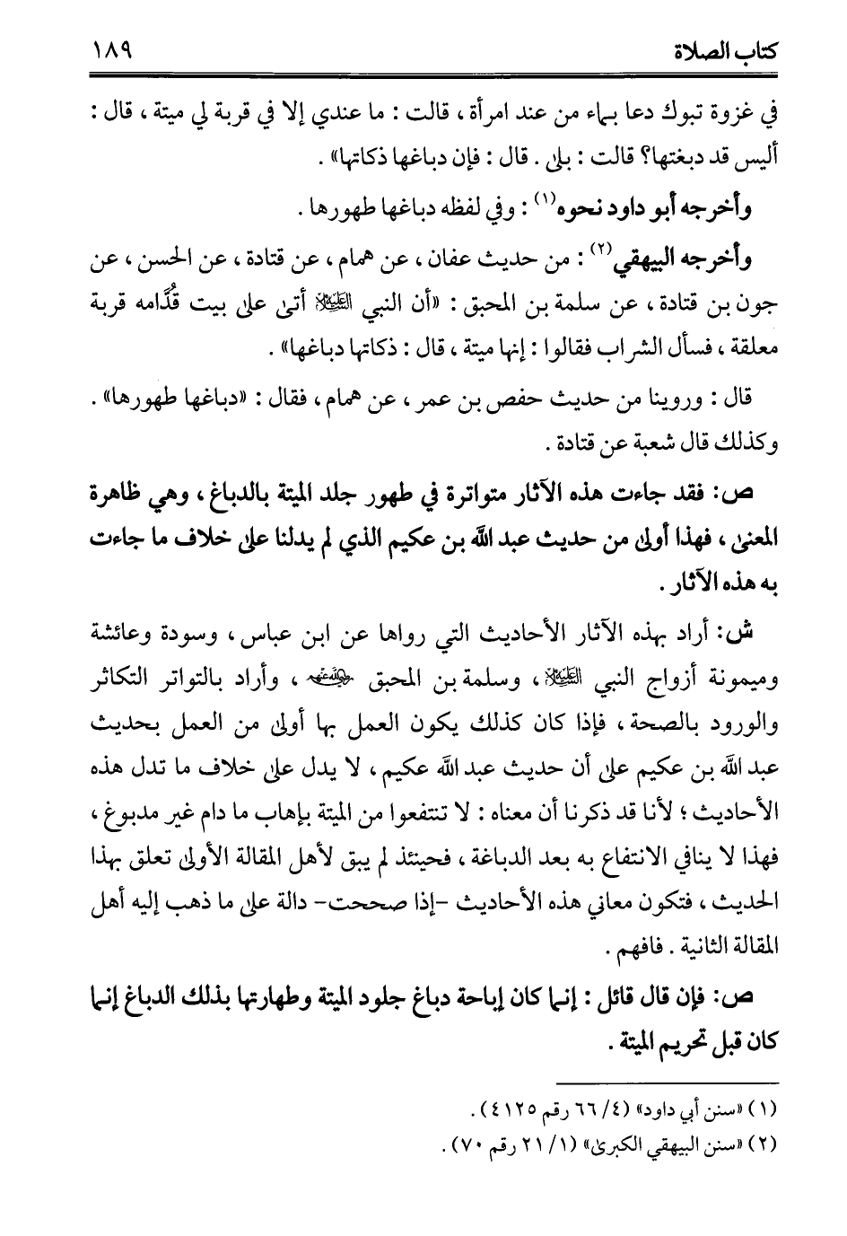 ص: فقد جاءت هذه الآثار متواترة في طهور جلد الميتة بالدباغ، وهي ظاهرة المعنى، فهذا أولى من حديث عبد الله بن عكيم الذي لم يدلنا على خلاف ما جاءت به هذه الآثار.