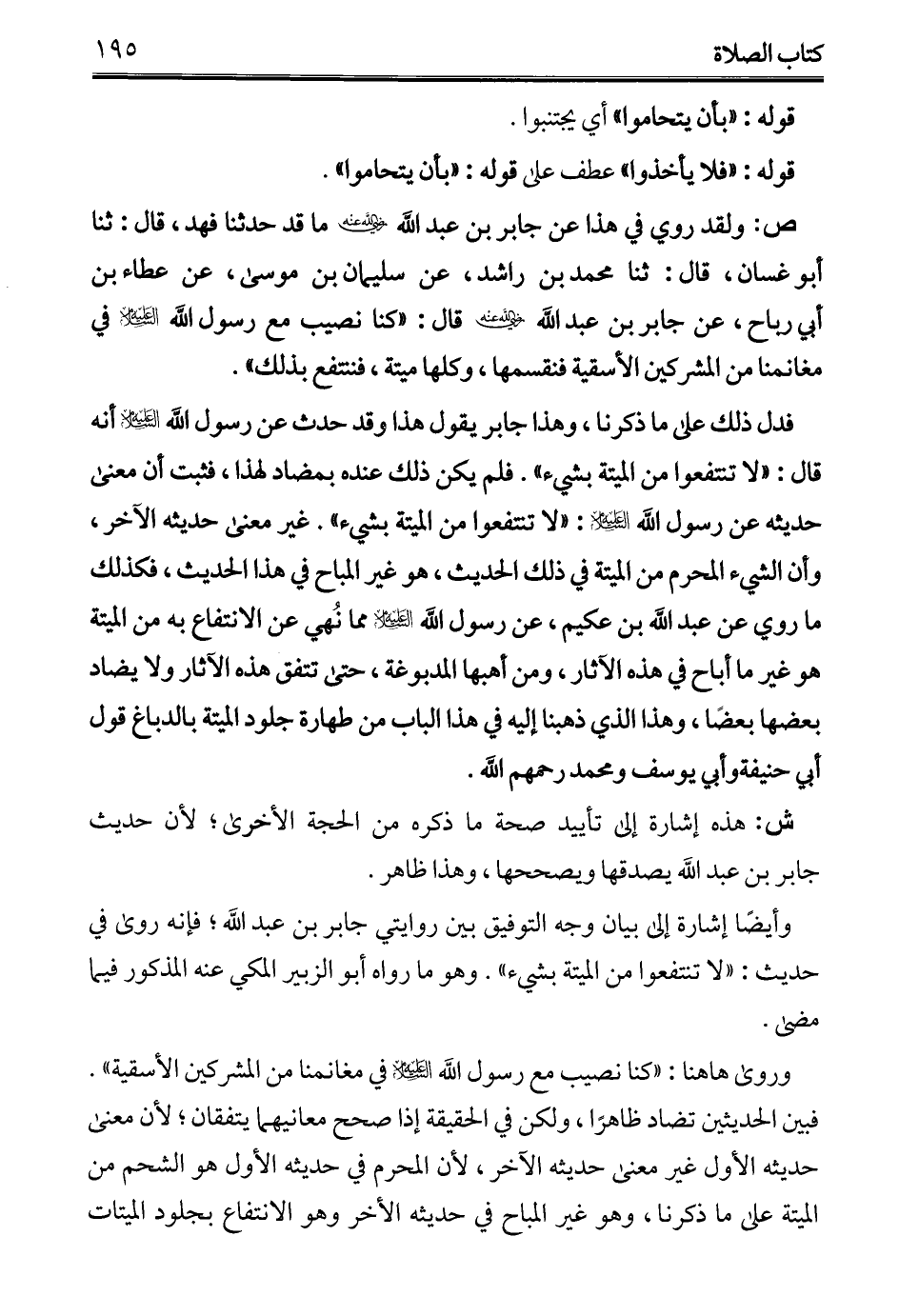 وأيضًا إشارة إلى بيان وجه التوفيق بين روايتي جابر بن عبد الله؛ فإنه روى في حديث: "لا تنتفعوا من الميتة بشيء". وهو ما رواه أبو الزبير المكي عنه المذكور فيما مضى.