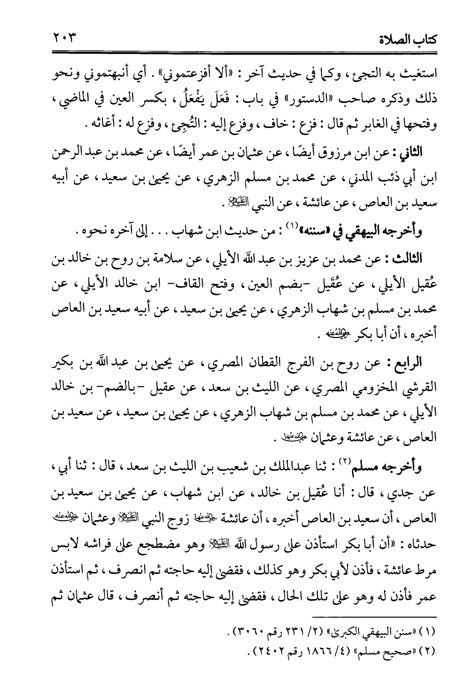 الرابع: عن روح بن الفرج القطان المصري، عن يحيى بن عبد الله بن بكير القرشي المخزومي المصري، عن الليث بن سعد، عن عقيل -بالضم- بن خالد الأيلي، عن محمد بن مسلم بن شهاب الزهري، عن يحيى بن سعيد، عن سعيد بن العاص، عن عائشة وعثمان - رضي الله عنهما -.