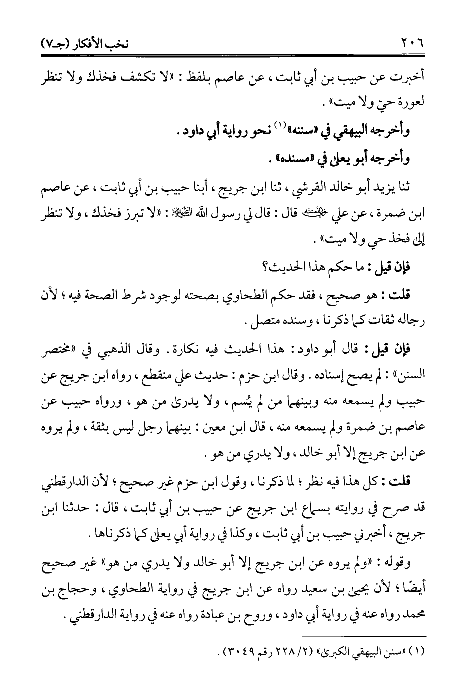 فإن قيل: قال أبو داود: هذا الحديث فيه نكارة. وقال الذهبي في "مختصر السنن": لم يصح إسناده. وقال ابن حزم: حديث علي منقطع، رواه ابن جريج عن حبيب ولم يسمعه منه وبينهما من لم يُسم، ولا يدرى من هو، ورواه حبيب عن عاصم بن ضمرة ولم يسمعه منه، قال ابن معين: بينهما رجل ليس بثقة، ولم يروه عن ابن جريج إلا أبو خالد، ولا يدري من هو.
