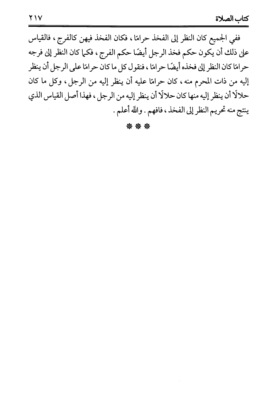 ففي الجميع كان النظر إلى الفخذ حرامًا، فكان الفخذ فيهن كالفرج، فالقياس على ذلك أن يكون حكم فخذ الرجل أيضًا حكم الفرج، فكما كان النظر إلى فرجه حرامًا كان النظر إلى فخذه أيضًا حرامًا، فنقول كل ما كان حرامًا على الرجل أن ينظر إليه من ذات المحرم منه، كان حرامًا عليه أن ينظر إليه من الرجل، وكل ما كان حلالًا أن ينظر إليه منها كان حلالًا أن ينظر إليه من الرجل، فهذا أصل القياس الذي ينتج منه تحريم النظر إلى الفخذ، فافهم. والله أعلم.