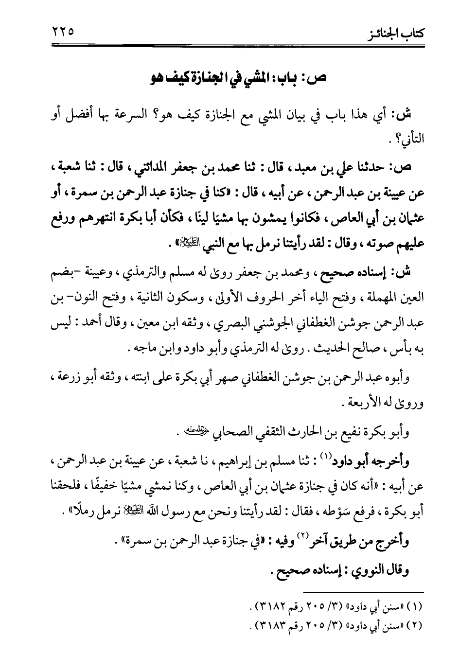 ص: حدثنا علي بن معبد، قال: ثنا محمد بن جعفر المدائني، قال: ثنا شعبة، عن عيينة بن عبد الرحمن، عن أبيه، قال: "كنا في جنازة عبد الرحمن بن سمرة، أو عثمان بن أبي العاص، فكانوا يمشون بها مشيا لينًا، فكان أبا بكرة انتهرهم ورفع عليهم صوته، وقال: لقد رأيتنا نرمل بها مع النبي - عليه السلام -".