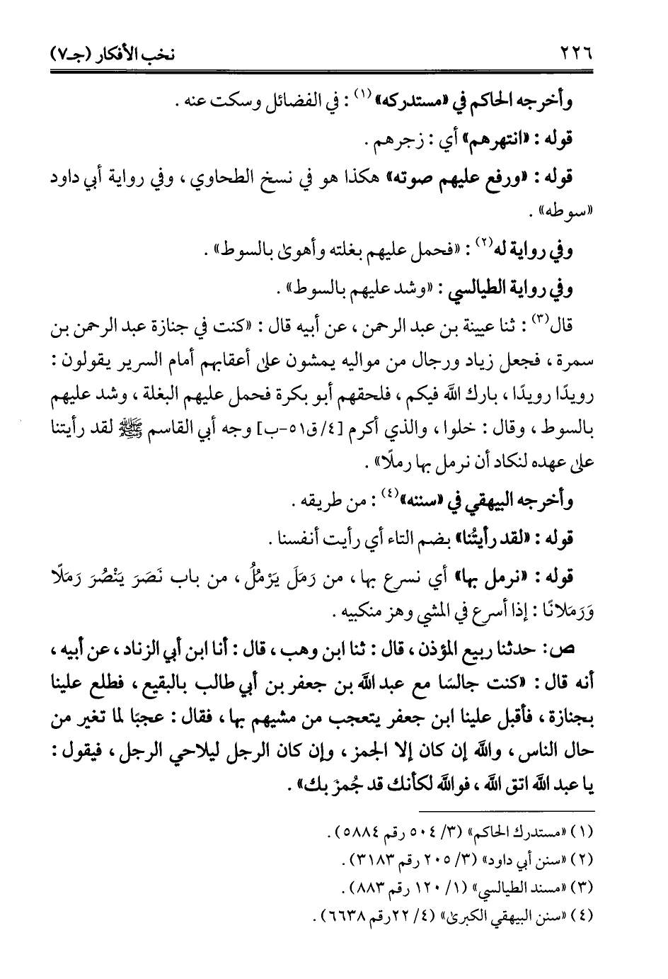 ص: حدثنا ربيع المؤذن، قال: ثنا ابن وهب، قال: أنا ابن أبي الزناد، عن أبيه، أنه قال: "كنت جالسًا مع عبد الله بن جعفر بن أبي طالب بالبقيع، فطلع علينا بجنازة، فأقبل علينا ابن جعفر يتعجب من مشيهم بها، فقال: عجبًا لما تغير من حال الناس، والله إن كان إلا الجمز، وإن كان الرجل ليلاحي الرجل، فيقول: يا عبد الله اتق الله، فوالله لكأنك قد جُمزَ بك".