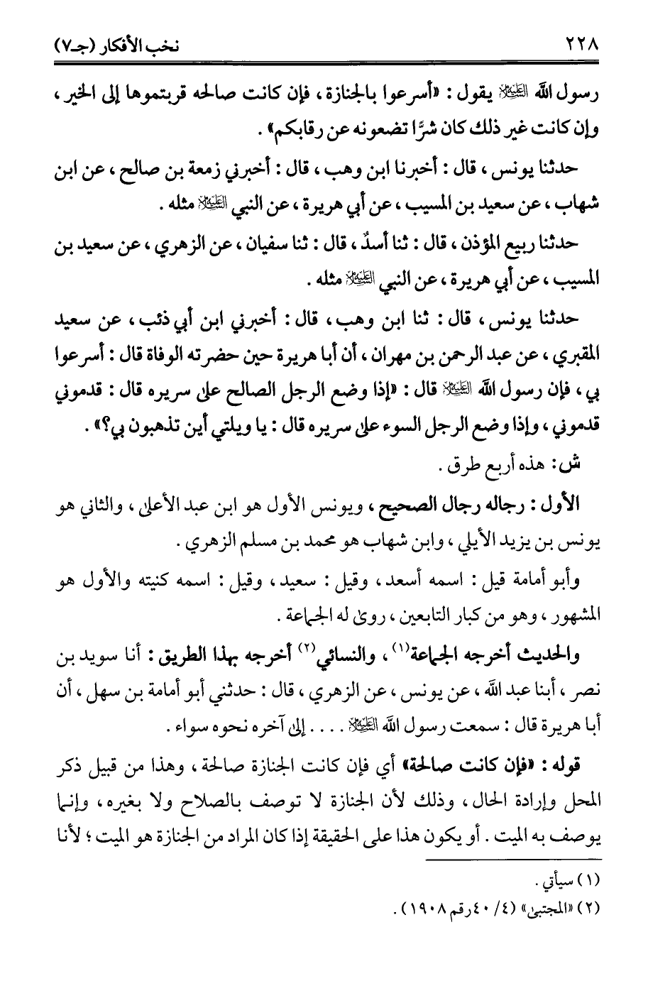 رسول الله - عليه السلام - يقول: "أسرعوا بالجنازة، فإن كانت صالحه قربتموها إلى الخير، وإن كانت غير ذلك كان شرًّا تضعونه عن رقابكم".