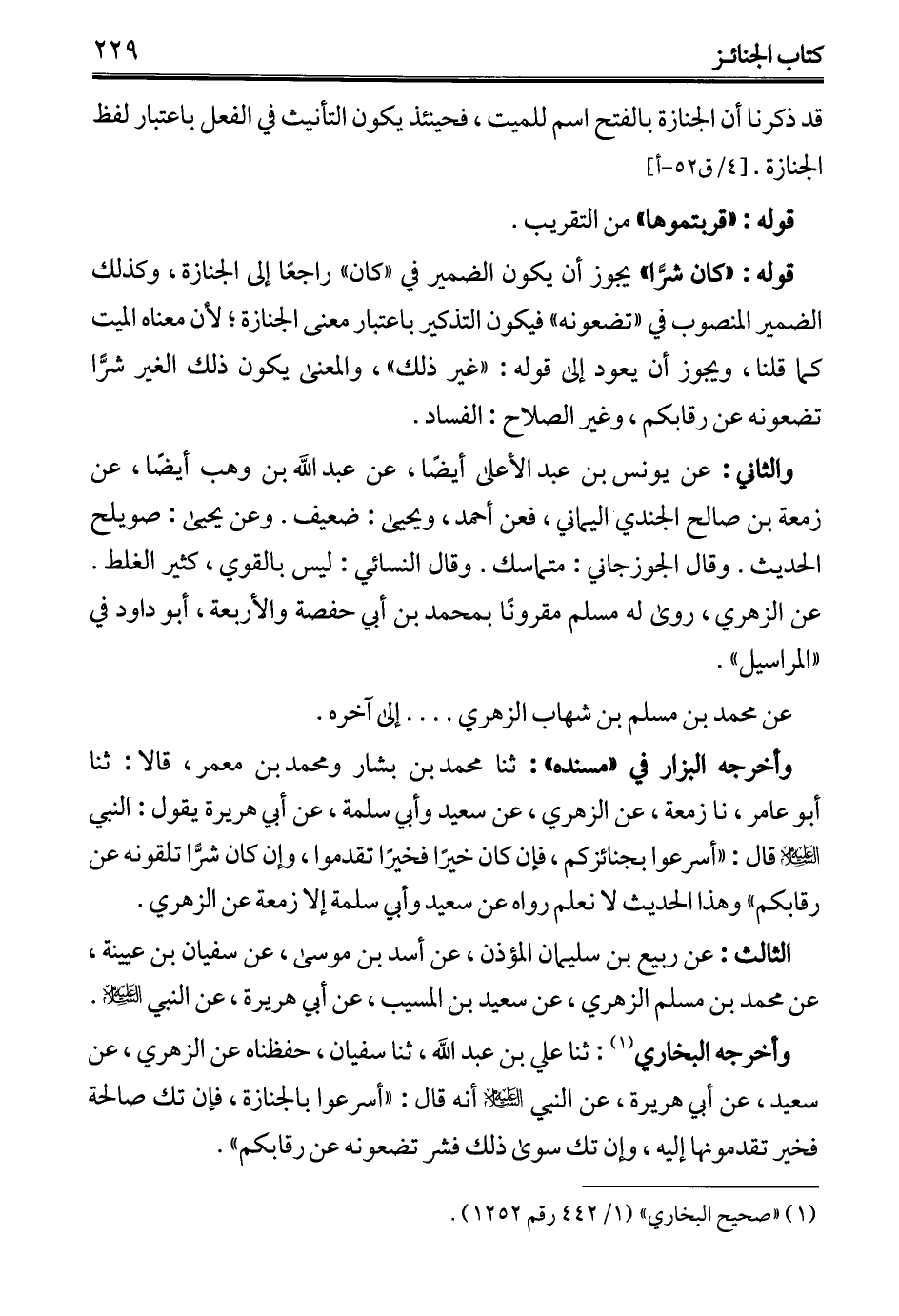 وأخرجه البزار في "مسنده": ثنا محمد بن بشار ومحمد بن معمر، قالا: ثنا أبو عامر، نا زمعة، عن الزهري، عن سعيد وأبي سلمة، عن أبي هريرة يقول: النبي - عليه السلام - قال: "أسرعوا بجنائزكم، فإن كان خيرًا فخيرًا تقدموا، وإن كان شرًّا تلقونه عن رقابكم" وهذا الحديث لا نعلم رواه عن سعيد وأبي سلمة إلا زمعة عن الزهري.
