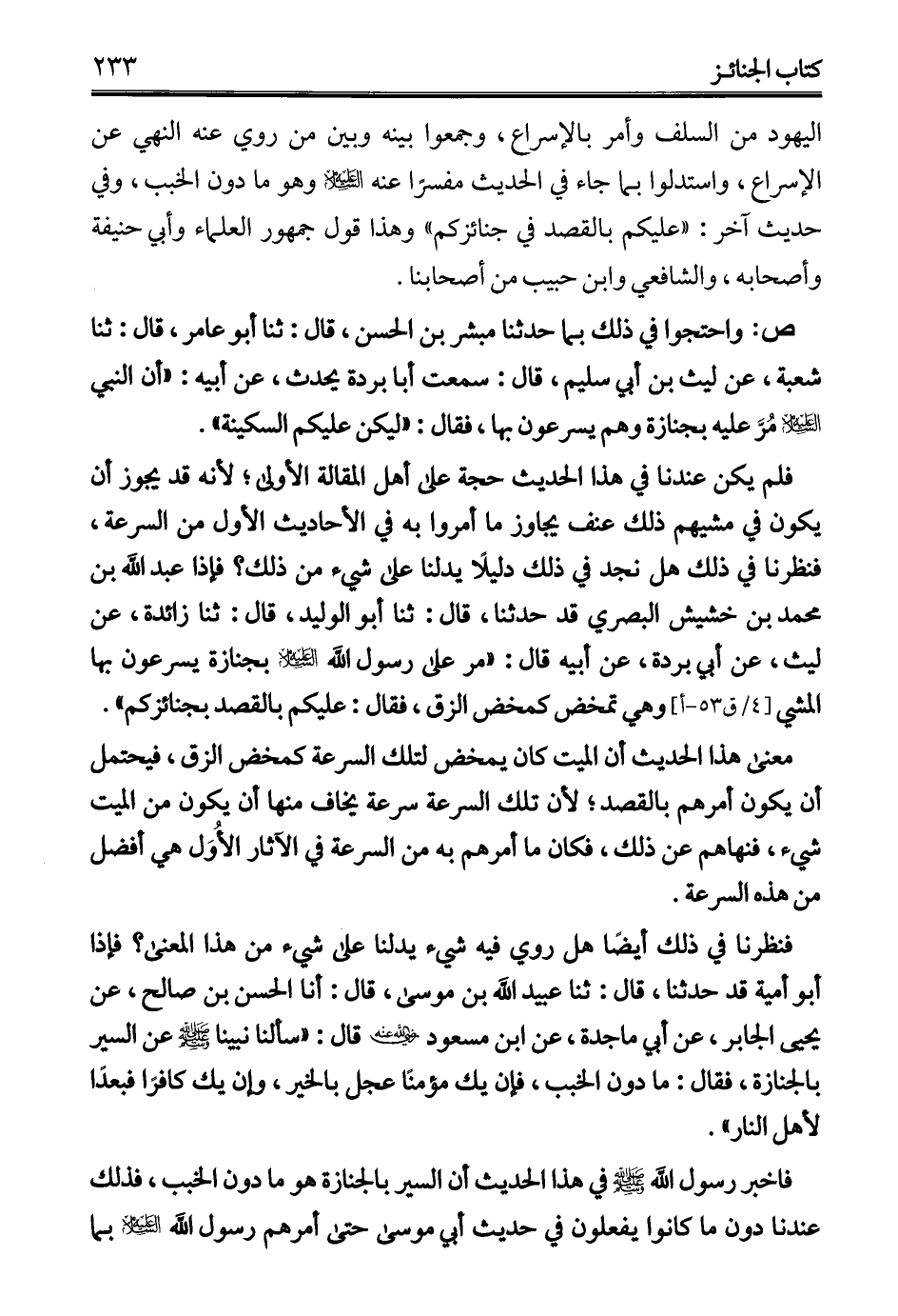 اليهود من السلف وأمر بالإسراع، وجمعوا بينه وبين من روي عنه النهي عن الإسراع، واستدلوا بما جاء في الحديث مفسرًا عنه وهو ما دون الخبب، وفي حديث آخر: "عليكم بالقصد في جنائزكم" وهذا قول جمهور العلماء وأبي حنيفة وأصحابه، والشافعي وابن حبيب من أصحابنا.