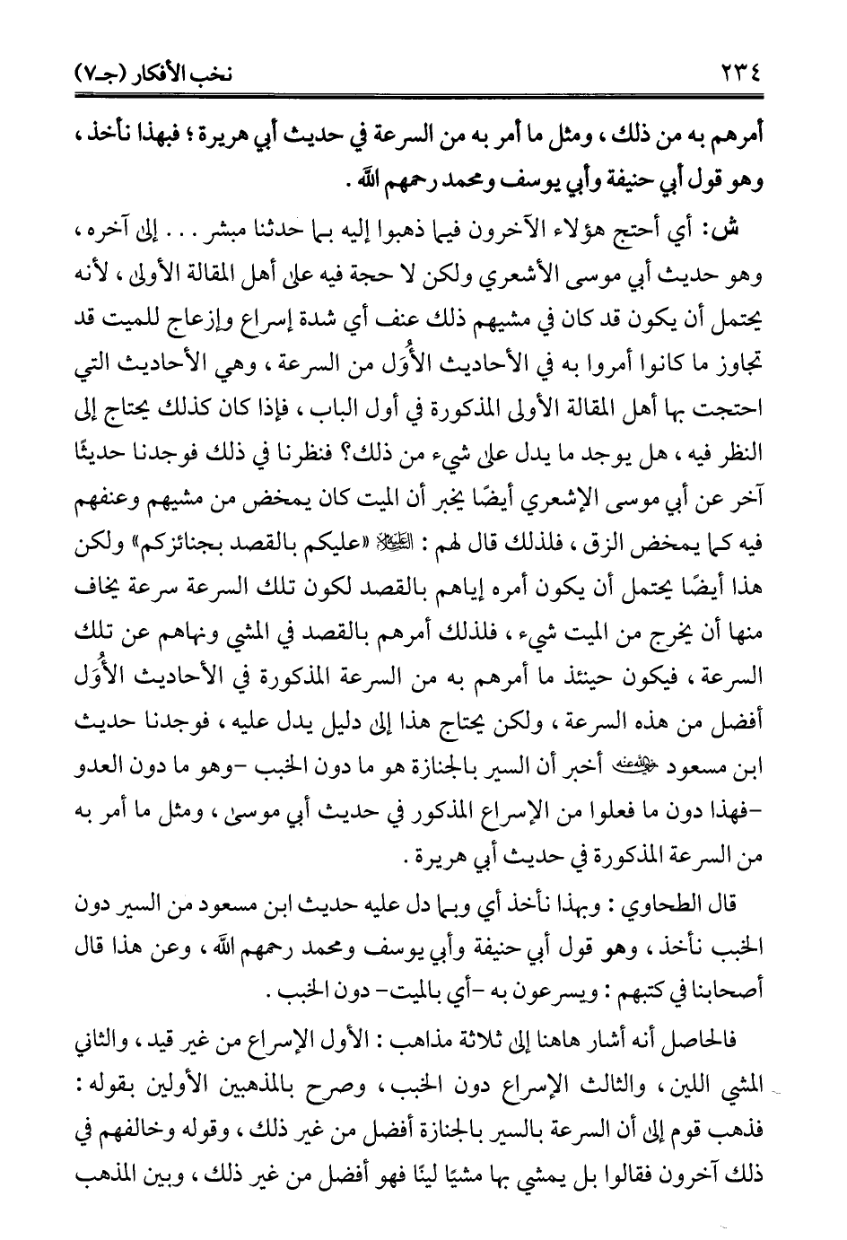 أمرهم به من ذلك، ومثل ما أمر به من السرعة في حديث أبي هريرة؛ فبهذا نأخذ، وهو قول أبي حنيفة وأبي يوسف ومحمد رحمهم الله.