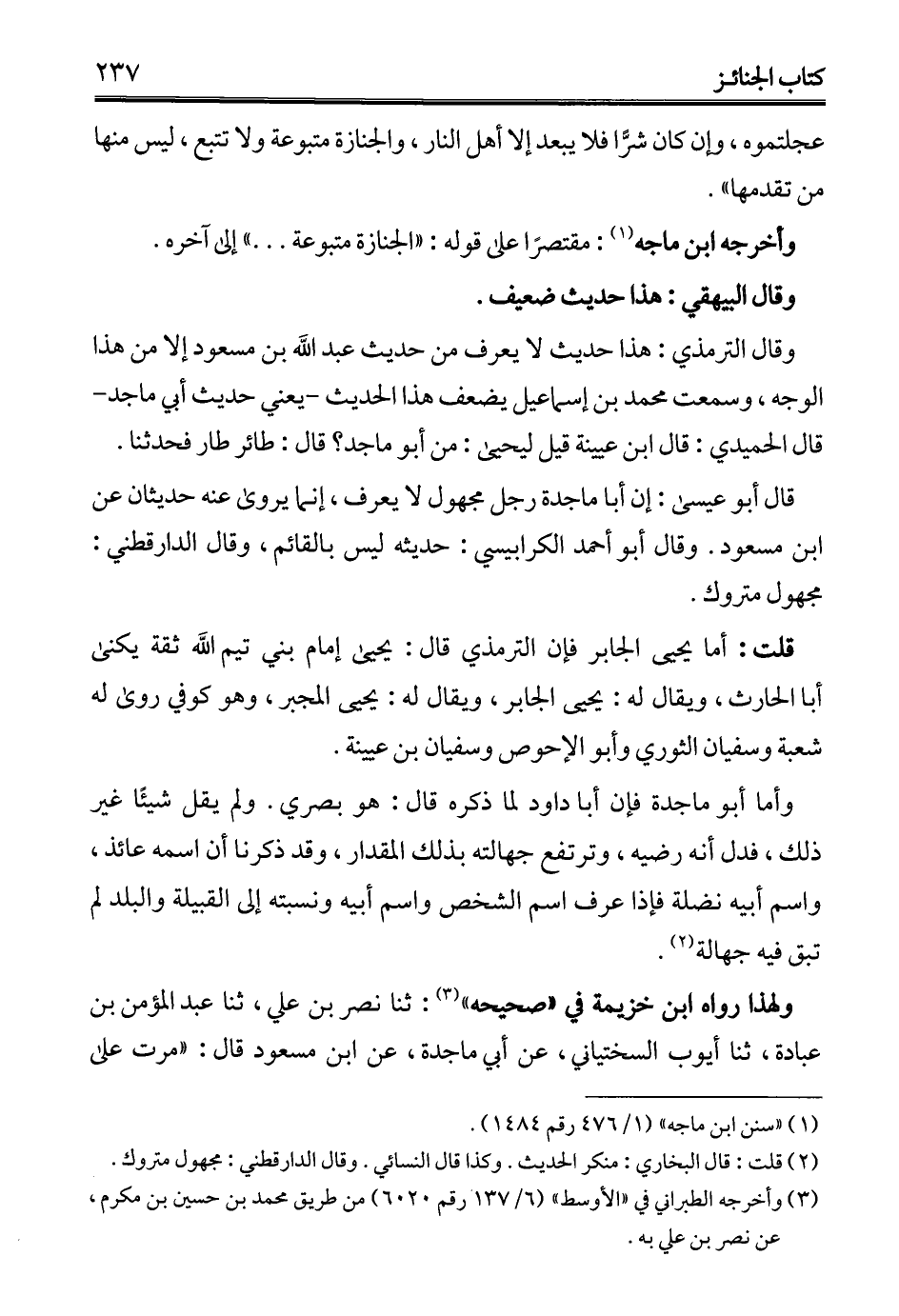 وقال الترمذي: هذا حديث لا يعرف من حديث عبد الله بن مسعود إلا من هذا الوجه، وسمعت محمد بن إسماعيل يضعف هذا الحديث -يعني حديث أبي ماجد- قال الحميدي: قال ابن عيينة قيل ليحيى: من أبو ماجد؟ قال: طائر طار فحدثنا.