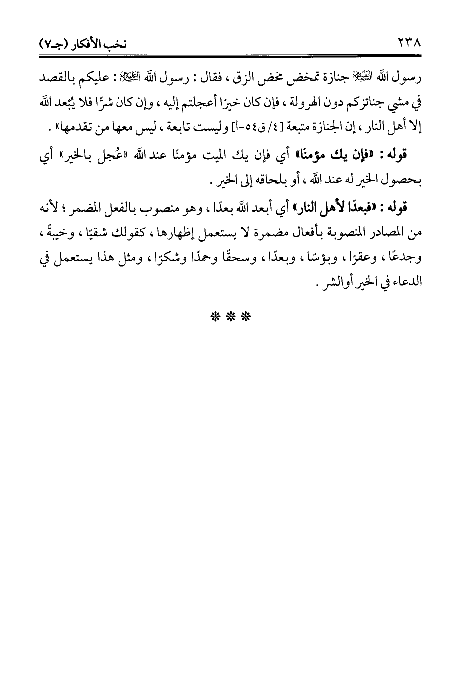 قوله: "فبعدًا لأهل النار" أي أبعد الله بعدًا، وهو منصوب بالفعل المضمر؛ لأنه من المصادر المنصوبة بأفعال مضمرة لا يستعمل إظهارها، كقولك شقيًا، وخيبةً، وجدعًا، وعقرًا، وبؤسًا، وبعدًا، وسحقًا وحمدًا وشكرًا، ومثل هذا يستعمل في الدعاء في الخير أو الشر.