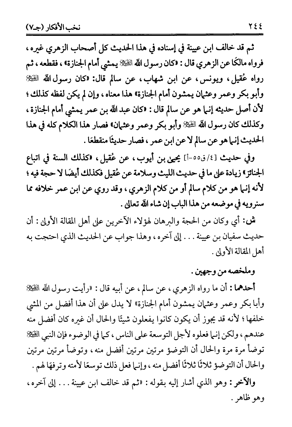ثم قد خالف ابن عيينة في إسناده في هذا الحديث كل أصحاب الزهري غيره، فرواه مالكًا عن الزهري قال: "كان رسول الله - عليه السلام - يمشي أمام الجنازة"، فقطعه، ثم رواه عُقيل، ويونس، عن ابن شهاب، عن سالم قال: "كان رسول الله - عليه السلام - وأبو بكر وعمر وعثمان يمشون أمام الجنازة" هذا معناه، وإن لم يكن لفظه كذلك؛ لأن أصل حديثه إنما هو عن سالم قال: "كان عبد الله بن عمر يمشي أمام الجنازة، وكذلك كان رسول الله - عليه السلام - وأبو بكر وعمر وعثمان" فصار هذا الكلام كله في هذا الحديث إنما هو عن سالم لا عن ابن عمر، فصار حديثًا منقطعًا.