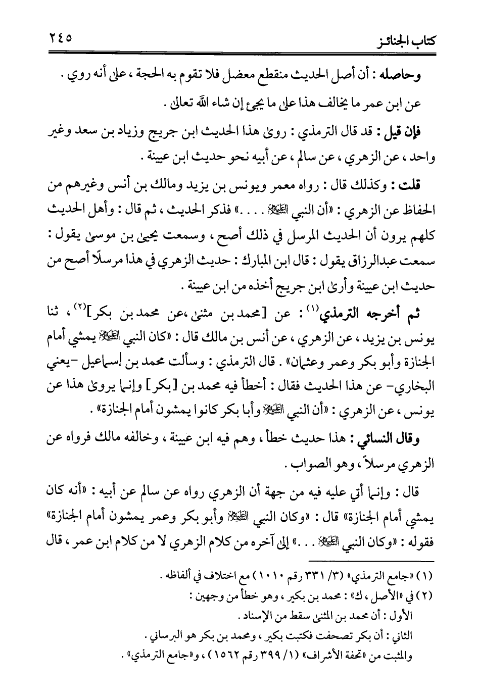 ثم أخرجه الترمذي (¬1): عن [محمد بن مثنى، عن محمد بن بكر] (¬2)، ثنا يونس بن يزيد، عن الزهري، عن أنس بن مالك قال: "كان النبي - عليه السلام - يمشي أمام الجنازة وأبو بكر وعمر وعثمان". قال الترمذي: وسألت محمد بن إسماعيل -يعني البخاري- عن هذا الحديث فقال: أخطأ فيه محمد بن [بكر] وإنما يروى هذا عن يونس، عن الزهري: "أن النبي - عليه السلام - وأبا بكر كانوا يمشون أمام الجنازة".