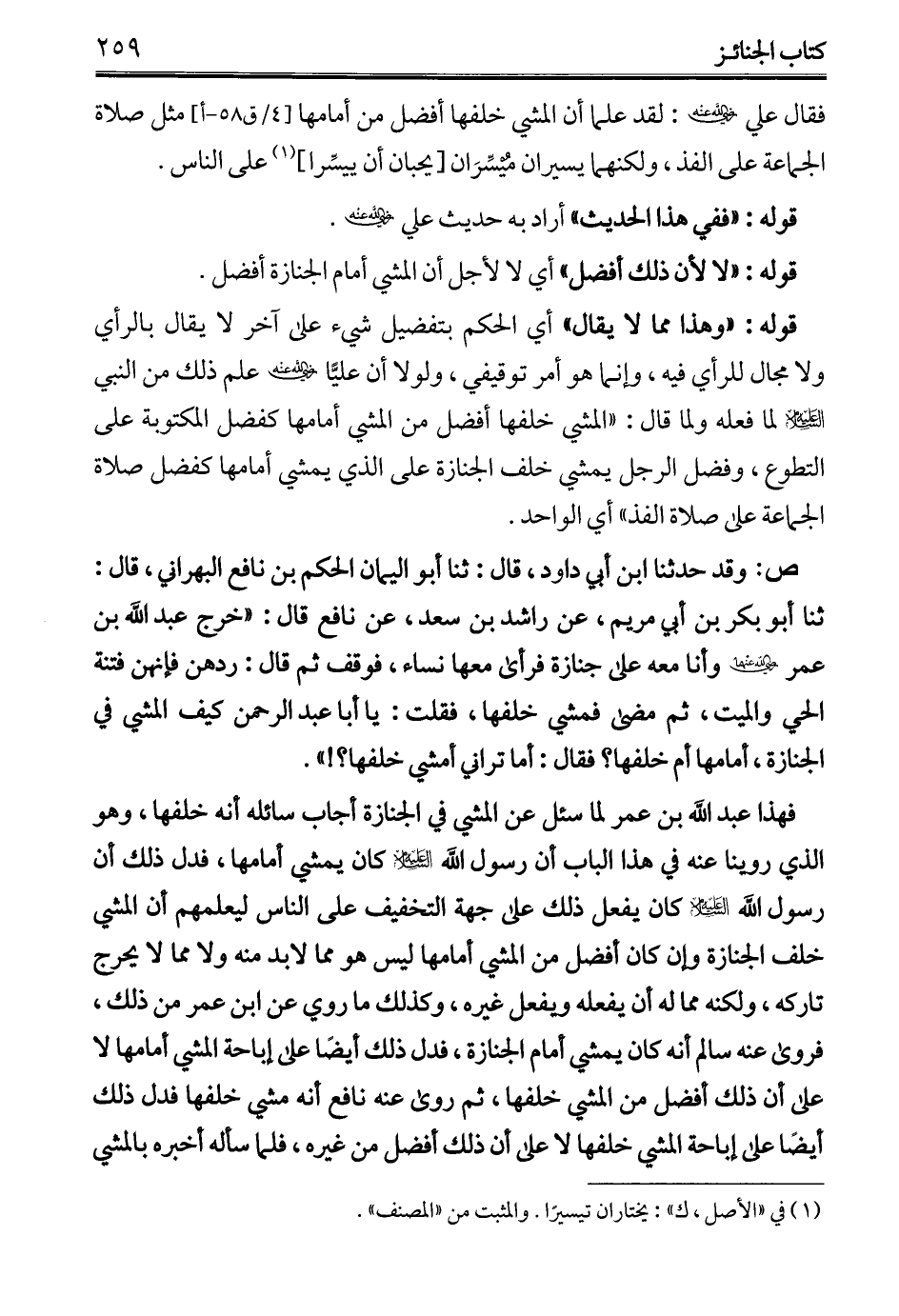 فقال علي - رضي الله عنه -: لقد علما أن المشي خلفها أفضل من أمامها مثل صلاة الجماعة على الفذ، ولكنهما يسيران مُيسِّرَان [يحبان أن ييسِّرا] (¬1) على الناس.