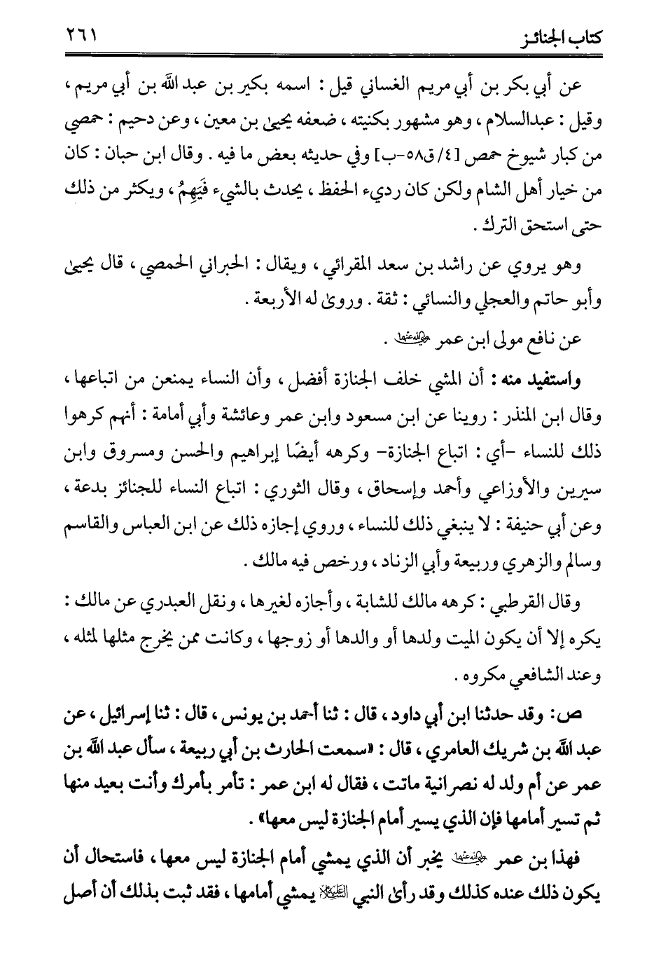 واستفيد منه: أن المشي خلف الجنازة أفضل، وأن النساء يمنعن من اتباعها، وقال ابن المنذر: روينا عن ابن مسعود وابن عمر وعائشة وأبي أمامة: أنهم كرهوا ذلك للنساء -أي: اتباع الجنازة- وكرهه أيضًا إبراهيم والحسن ومسروق وابن سيرين والأوزاعي وأحمد وإسحاق، وقال الثوري: اتباع النساء للجنائز بدعة، وعن أبي حنيفة: لا ينبغي ذلك للنساء، وروي إجازه ذلك عن ابن العباس والقاسم وسالم والزهري وربيعة وأبي الزناد، ورخص فيه مالك.