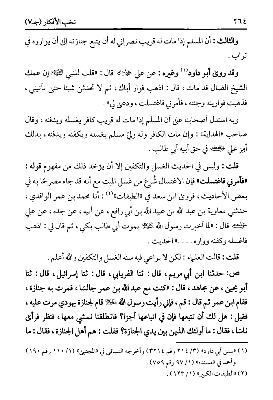 وقد روى أبو داود (¬1) وغيره: عن علي - رضي الله عنه - قال: "قلت للنبي - عليه السلام - إن عمك الشيخ الضال قد مات، قال: اذهب فوار أباك، ثم لا تحدثن شيئا حتى تأتيني، فذهبت فواريته وجئته، فأمرني فاغتسلت، ودعى لي".