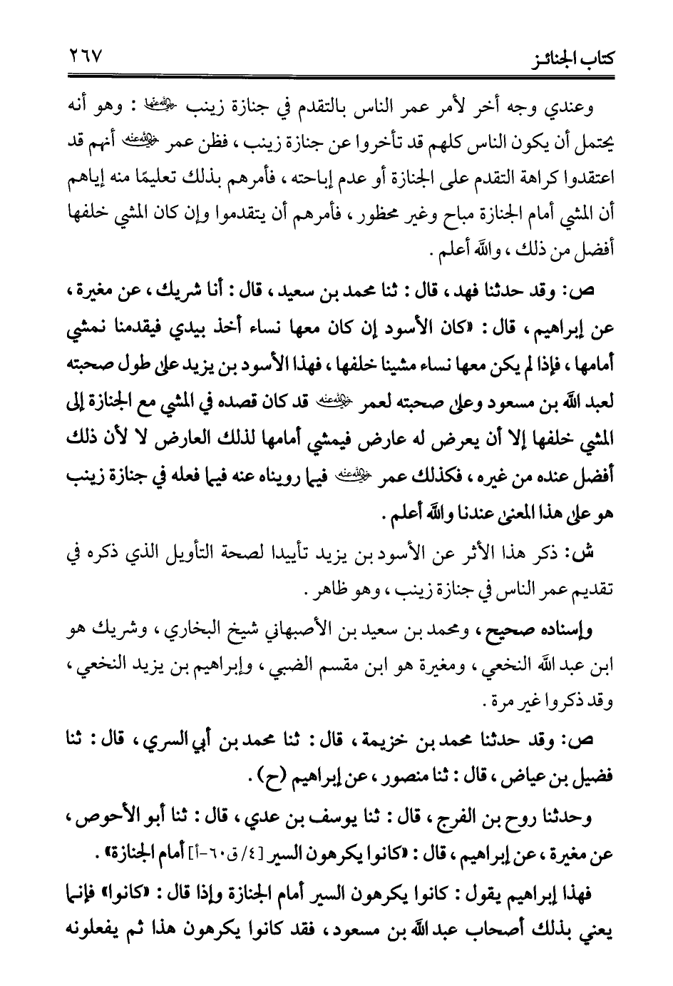 ص: وقله حدثنا فهد، قال: ثنا محمد بن سعيد، قال: أنا شريك، عن مغيرة، عن إبراهيم، قال: "كان الأسود إن كان معها نساء أخد بيدي فيقدمنا نمشي أمامها، فإذا لم يكن معها نساء مشينا خلفها، فهذا الأسود بن يزيد على طول صحبته لعبد الله بن مسعود وعلى صحبته لعمر - رضي الله عنه - قد كان قصده في المشي مع الجنازة إلى المشي خلفها إلا أن يعرض له عارض فيمشي أمامها لذلك العارض لا لأن ذلك أفضل عنده من غيره، فكذلك عمر - رضي الله عنه - فيما رويناه عنه فيما فعله في جنازة زينب هو على هذا المعنى عندنا والله أعلم.