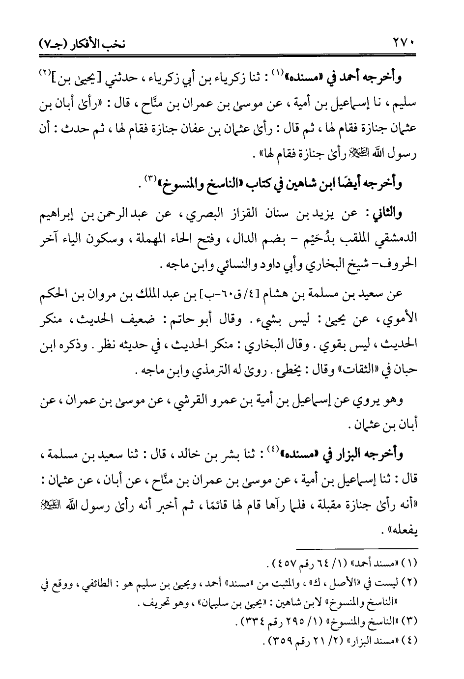 وأخرجه أحمد في "مسنده" (¬1): ثنا زكرياء بن أبي زكرياء، حدثني [يحيى بن] (¬2) سليم، نا إسماعيل بن أمية، عن موسى بن عمران بن منَّاح، قال: "رأى أبان بن عثمان جنازة فقام لها، ثم قال: رأى عثمان بن عفان جنازة فقام لها، ثم حدث: أن رسول الله - عليه السلام - رأى جنازة فقام لها".