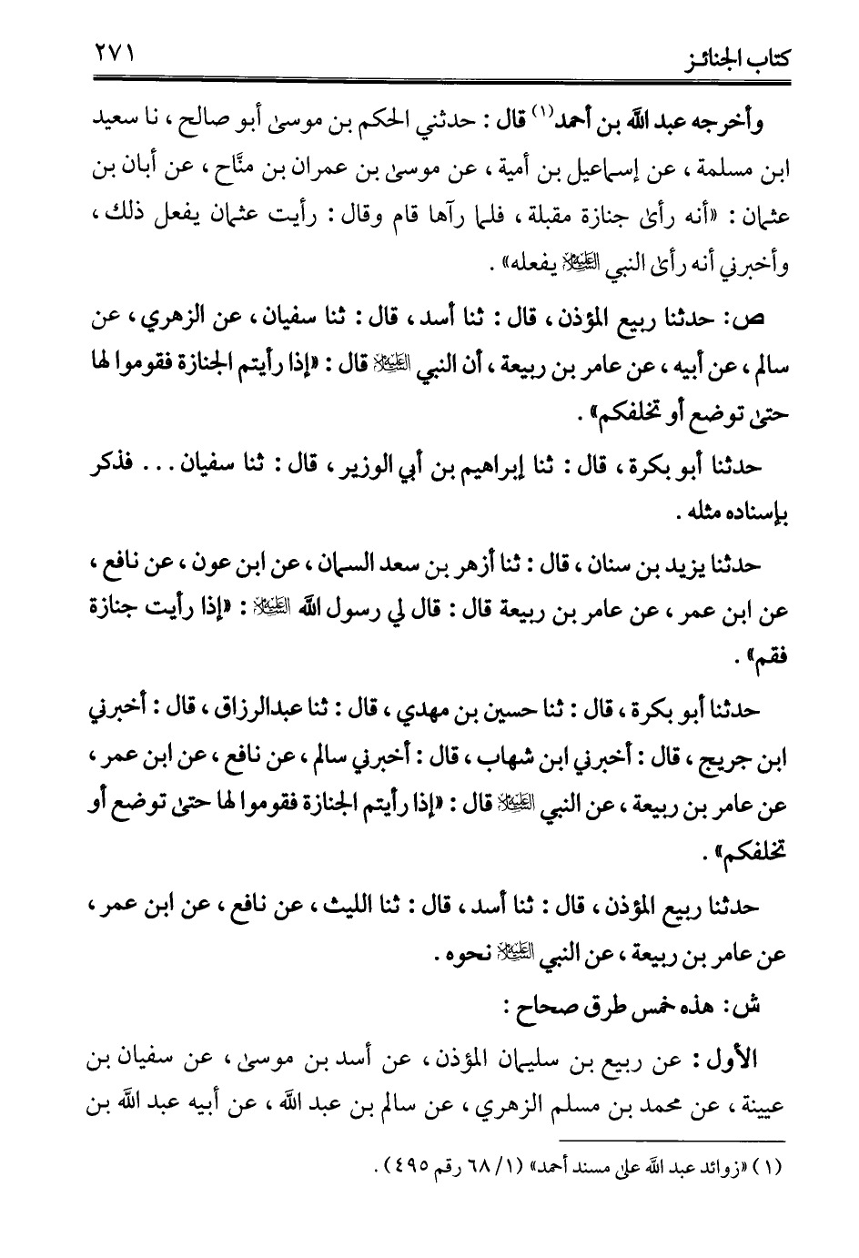 ص: حدثنا ربيع المؤذن، قال: ثنا أسد، قال: ثنا سفيان، عن الزهري، عن سالم، عن أبيه، عن عامر بن ربيعة، أن النبي - عليه السلام -: "إذا رأيتم الجنازة فقدموا لها حتى توضع أو تخلفكم".