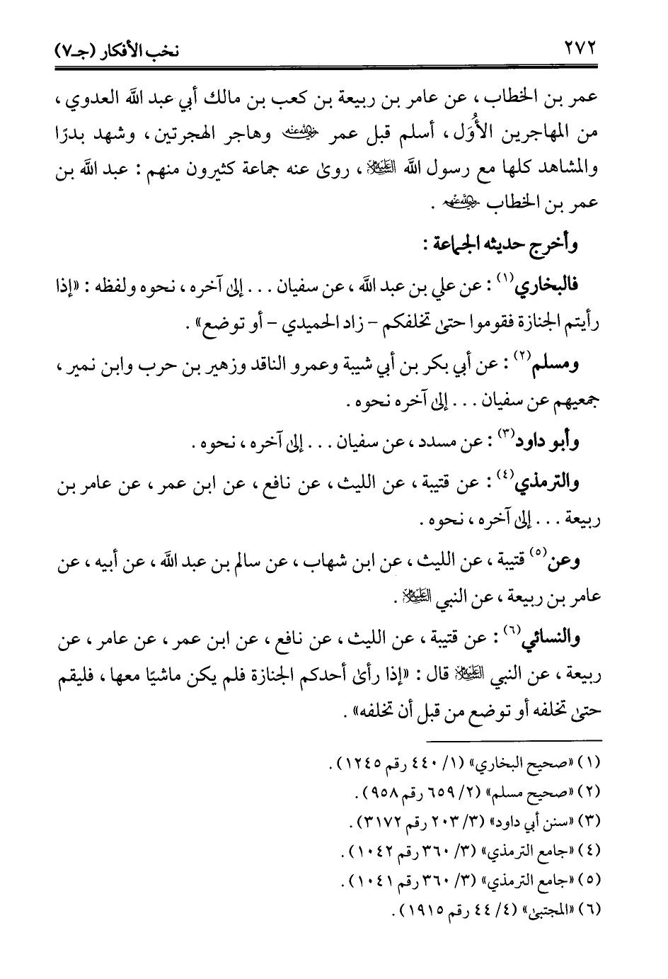 والنسائي (¬6): عن قتيبة، عن الليث، عن نافع، عن ابن عمر، عن عامر، عن ربيعة، عن النبي - عليه السلام - قال: "إذا رأى أحدكم الجنازة فلم يكن ماشيًا معها، فليقم حتى تخلفه أو توضع من قبل أن تخلفه".