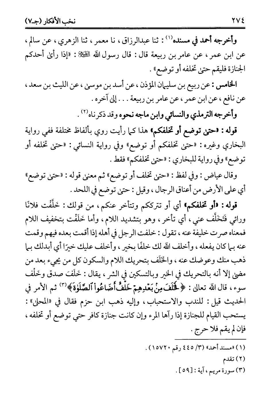 وأخرجه أحمد في مسنده (¬1): ثنا عبد الرزاق، نا معمر، ثنا الزهري، عن سالم، عن ابن عمر، عن عامر بن ربيعة قال: قال رسول الله - عليه السلام -: "إذا رأى أحدكم الجنازة فليقم حتى تخلفه أو توضع".